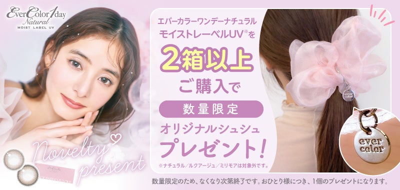 対象のWEB店舗にてエバーカラーワンデーナチュラルモイストレーベルUVを2箱以上お買い求め頂いたお客様に、先着でエバーカラーオリジナルシュシュをプレゼントいたします。