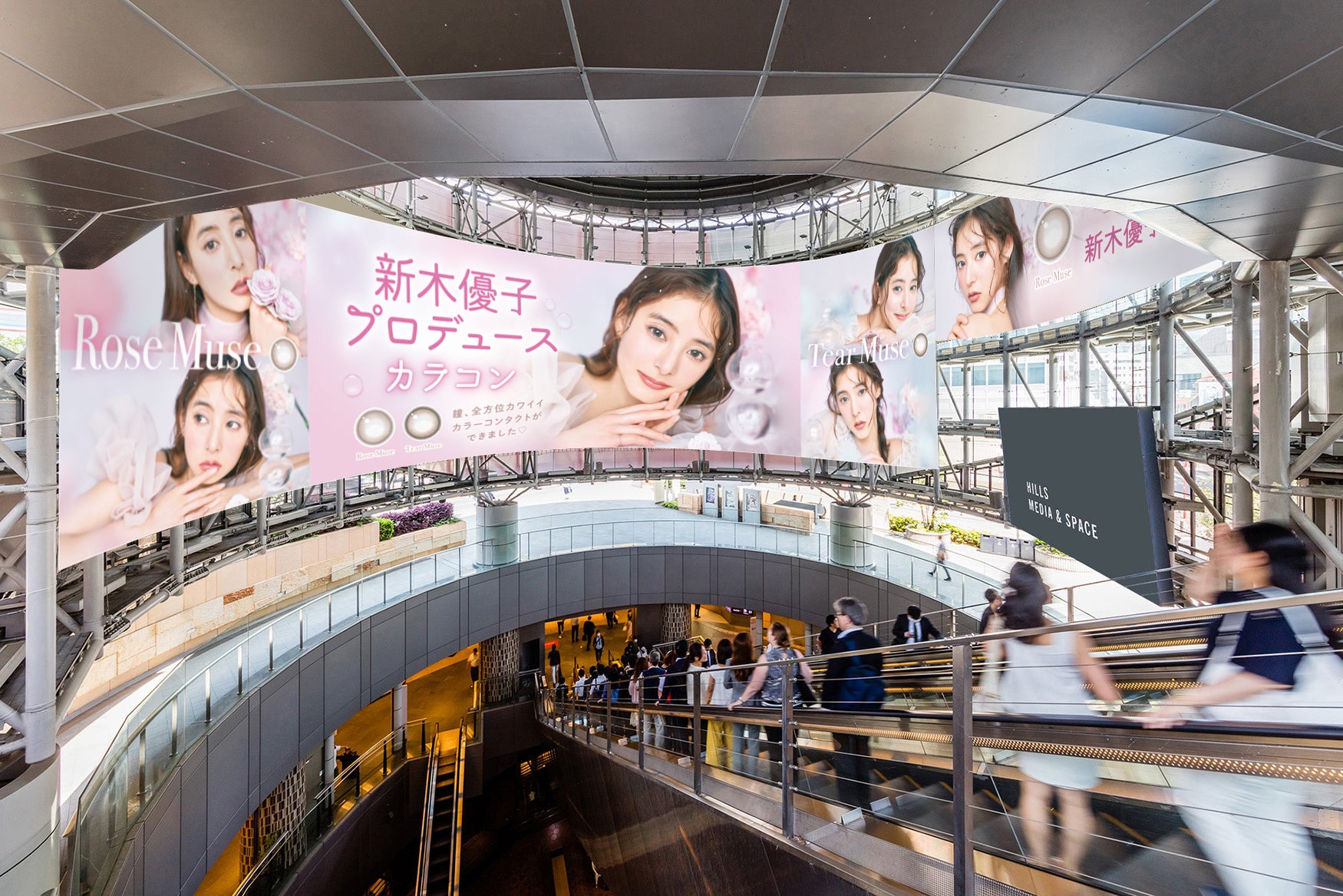 新木優子さん初プロデュースカラーコンタクトの発売に合わせて、今回のコンセプトである「瞳、全方位カワイイ」と連動した広告施策「全方位から見つめられる!?瞳、全方位カワイイ新木優子」を2024年7月2日(火)より、六本木ヒルズ メトロハットにて実施いたします。