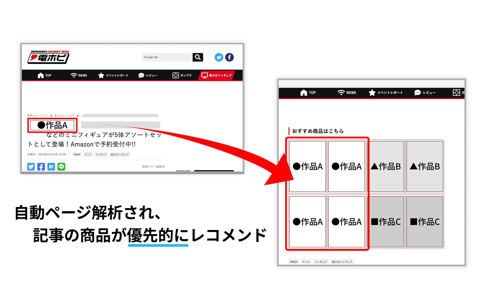 EC・メディア、双方の情報を掛け合わせ、メディアサイト内の記事ページにて、そのページで紹介されている商品や作品の商品をレコメンドで表示する仕組みです。