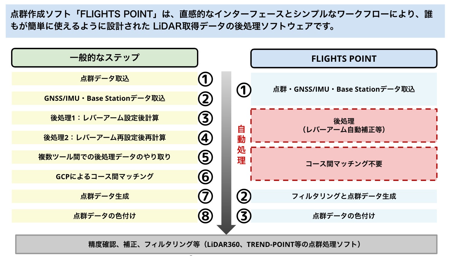 そこで、当社ではこれらの複雑な調整を自動化し、さらには熟練の技術者にとっても満足いただける高いクオリティのデータ生成を可能にするソフトウェアとして、従来の点群生成ソフウェアをリニューアルし、より効率化された「FLIGHTS POINT」提供を開始するに至りました。