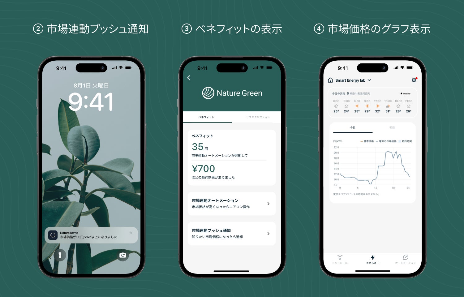 「Nature Remo」のユーザーを対象とし、月額150円(税込)で日本卸電力取引所のエリアプライスに連動したエアコンの自動制御や市場価格変動の通知機能をご利用いただけます。