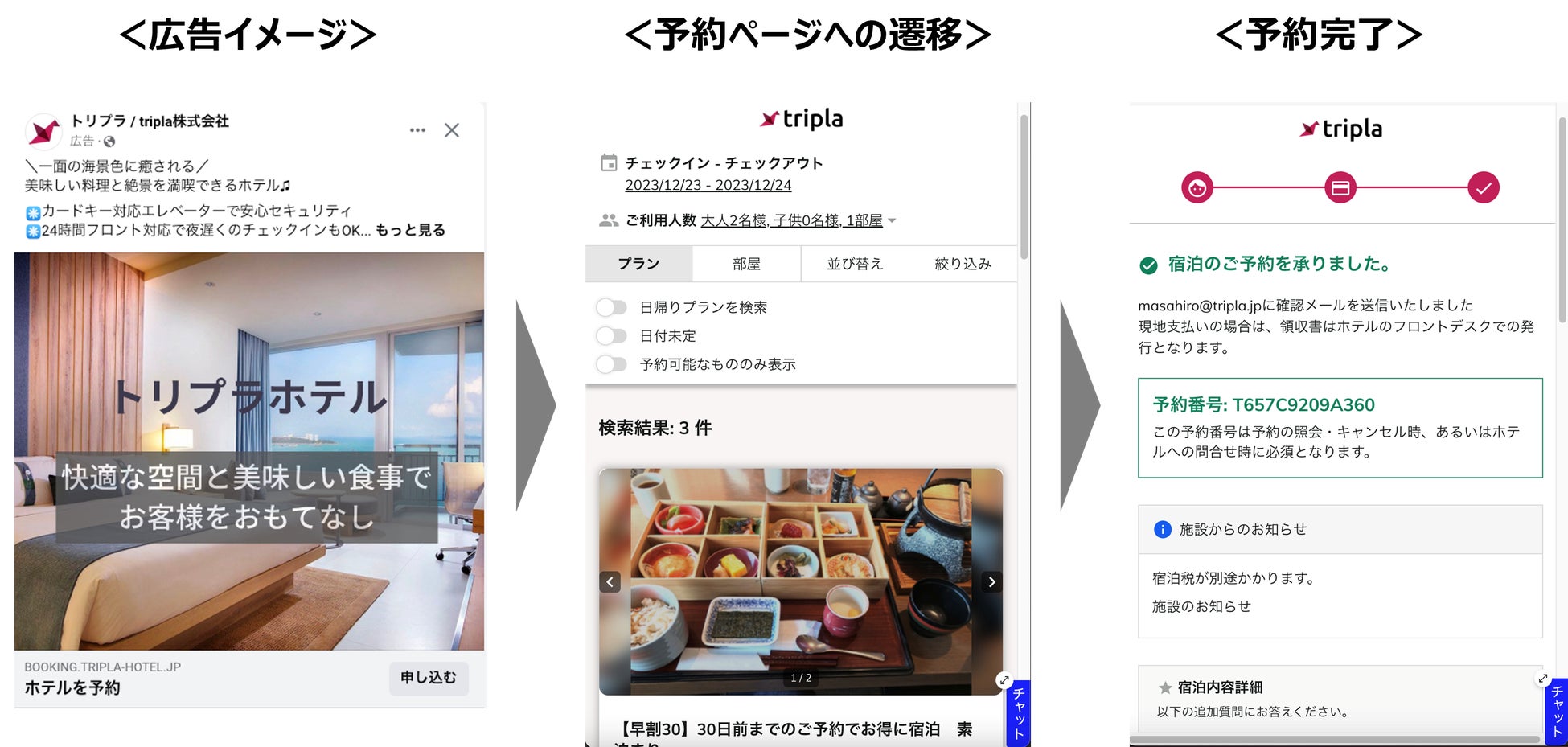 また、「tripla Boost」は、予約エンジン「tripla Book」と連携することで、広告運用にて取得したデータと宿泊データを紐づけた顧客層の特定が容易になり、費用対効果の高い広告運用と、顧客属性に沿ったリピート施策が実現できます。