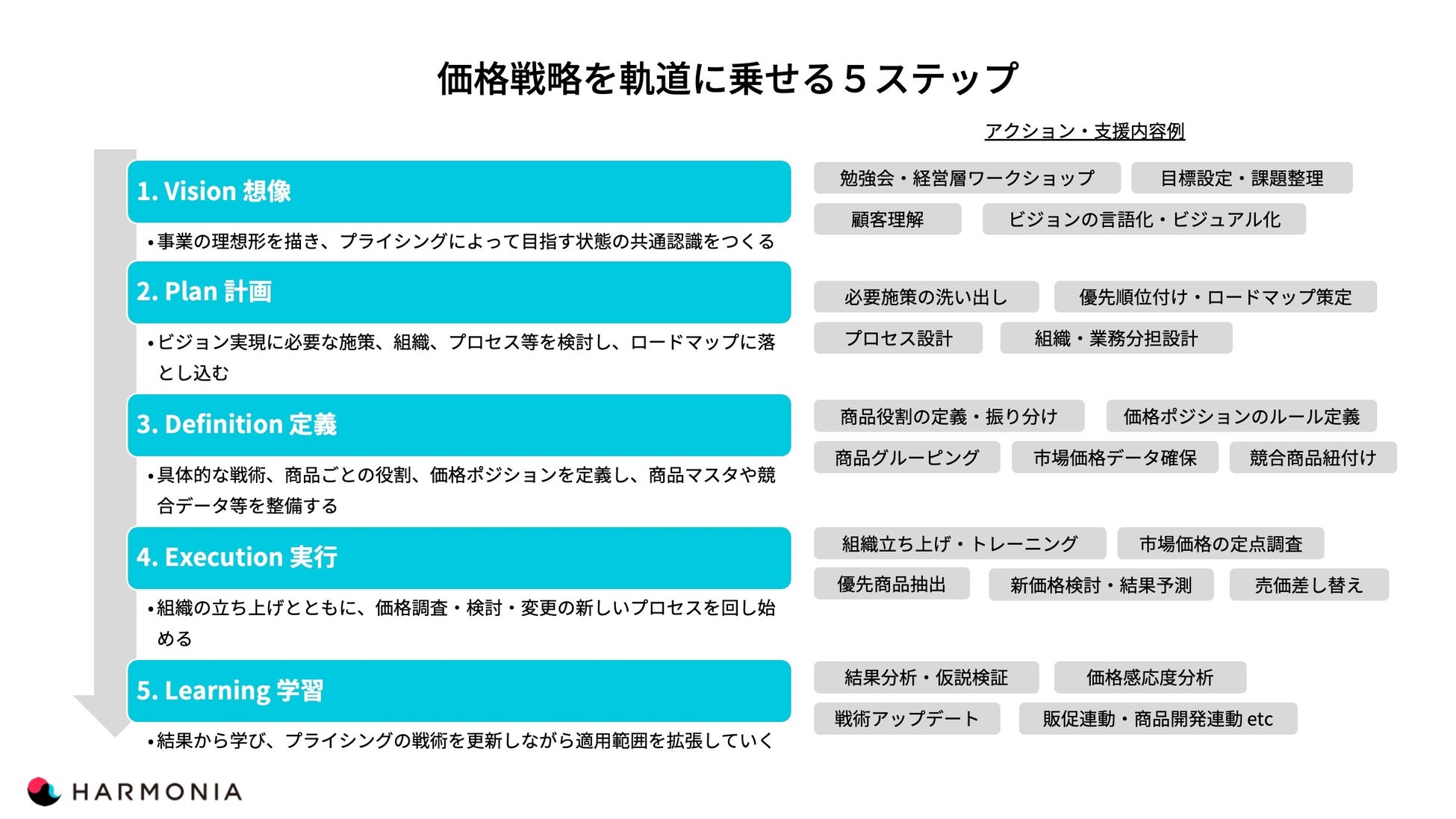 価格戦略を再定義し、軌道に乗せるまでのプロセスは個別性・複雑性が高いものではありますが、ハルモニアではそれらを5つのステップに整理しています。