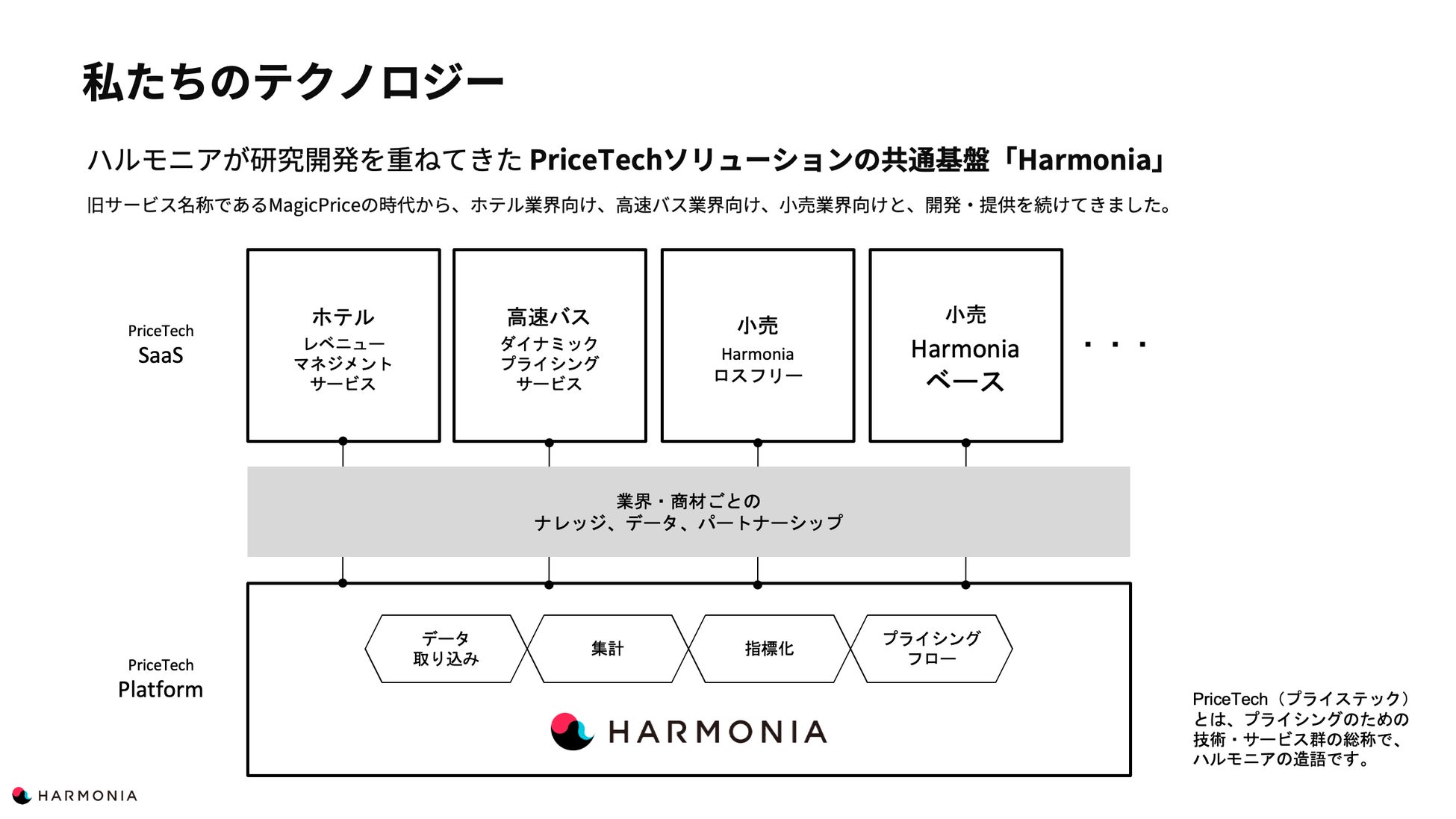今回のサービスは、ハルモニアが研究開発を重ねてきたPriceTechソリューションの共通基盤「Harmonia」を活用した、特定業界向けSaaSの位置付けです。旧サービス名称であるMagicPriceの時代から、ホテル業界向け、高速バス業界向け、小売業界向けと、開発・提供を続けてまいりました。