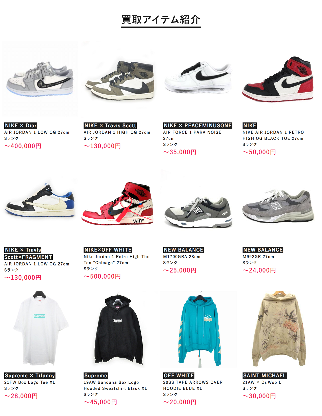 NIKE / Supreme / KITH / OFF-WHITE / READYMADE / adidas / NEWBALANCE / sacai / MAISON MARGIERA / LOUIS VUITTON / BALENCIAGA / MONCLER / THE NORTH FACE / VETEMENTS / FRAGMENT / ANTI SOCIAL SOCIAL CLUB / A BATHING APE / CONVERS / CACTUS JACK / FEAR OF GOD / NEWERA / YOHJI YAMAMOTO / STUSSY / HUMANMADE / KAWS / Dior / WTAPS / COMME des GARCONS / SAINT Mxxxxxx / DESCENDANT / FR2 / UNDER COVER etc.