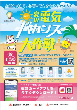 株式会社東急パワーサプライ(以下、「東急パワーサプライ」)と東急株式会社(以下、「東急」)は、東急カード株式会社、株式会社東急モールズデベロップメント及び環境省地球環境局デコ活応援隊(脱炭素ライフスタイル推進室)とともに、“お出かけして、気分もカラダもひんやりしよう!”をテーマとする、お出かけ誘導型節電プロジェクト『夏の電気バカンス大作戦2025』(以下、「本プロジェクト」)を7月1日(火)より開始します。