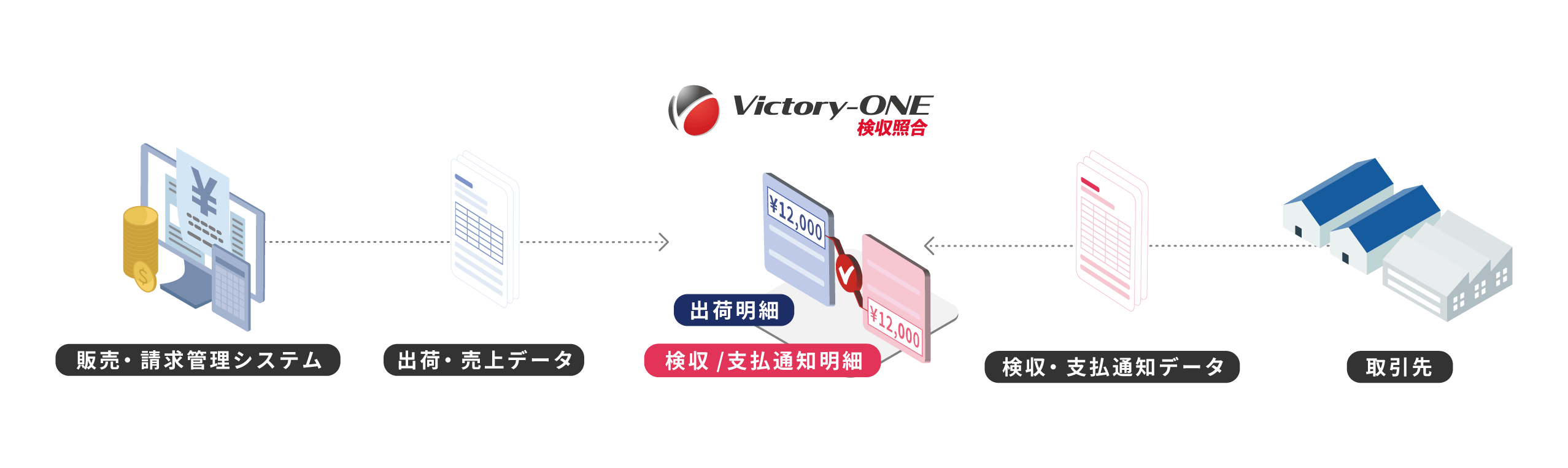 「Victory-ONE【検収照合】」は、製造業や卸売業などの企業間継続取引で頻繁に発生する出荷情報と検収情報の照合を自動化するシステムです。製造業や卸売業などは、各地に拠点を持つ企業が多く、拠点に属する営業担当者が取引先の入金確認を行うことがあります。