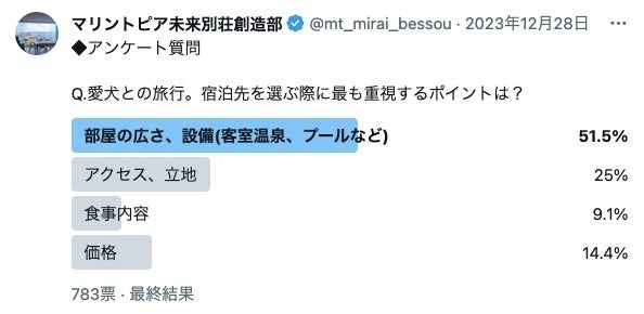 開業発表にあわせて改めてアンケート調査を行ったところ、「愛犬との旅行、宿泊先を選ぶ際に最も重視するポイントは?」という質問に対し、783票の有効回答者のうち51.5%が「部屋の広さ、設備(客室温泉、プールなど)」と回答しました。また「愛犬と宿泊する際にあったら嬉しい設備・サービスは?」という問いに対し、602票の有効回答者のうち40%が「愛犬と一緒に利用できるカフェ、レストラン」と回答しています。この結果からも、愛犬家の方に求められる自慢の施設となっておりますので、会員様以外の愛犬家の皆様にもぜひ一度お越しいただきたいと考えております。