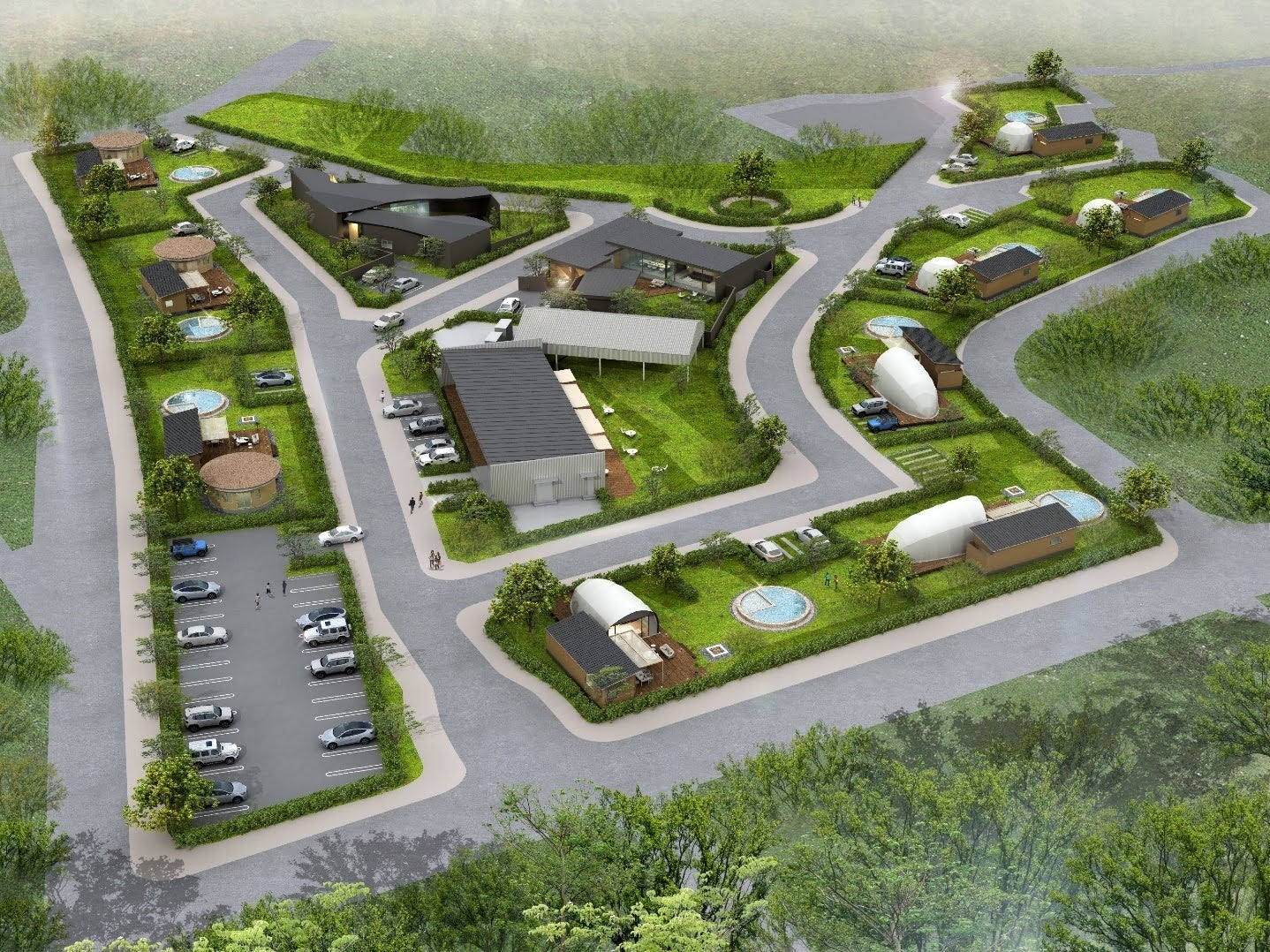 関東平野の一角にある茨城県常陸小美玉エリアに、敷地面積30,000㎡超を誇る大型ドッグリゾートが開業します。敷地内には床面積約250㎡のプレミアムヴィラ2棟、床面積200㎡のドッグランコテージ3棟、ドッグランドーム3棟、ドッグランコクーン3棟の全11棟の宿泊棟があり、愛犬同伴型施設としては関東エリア最大級の規模となります。