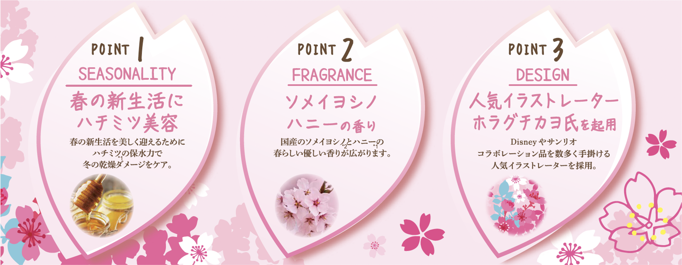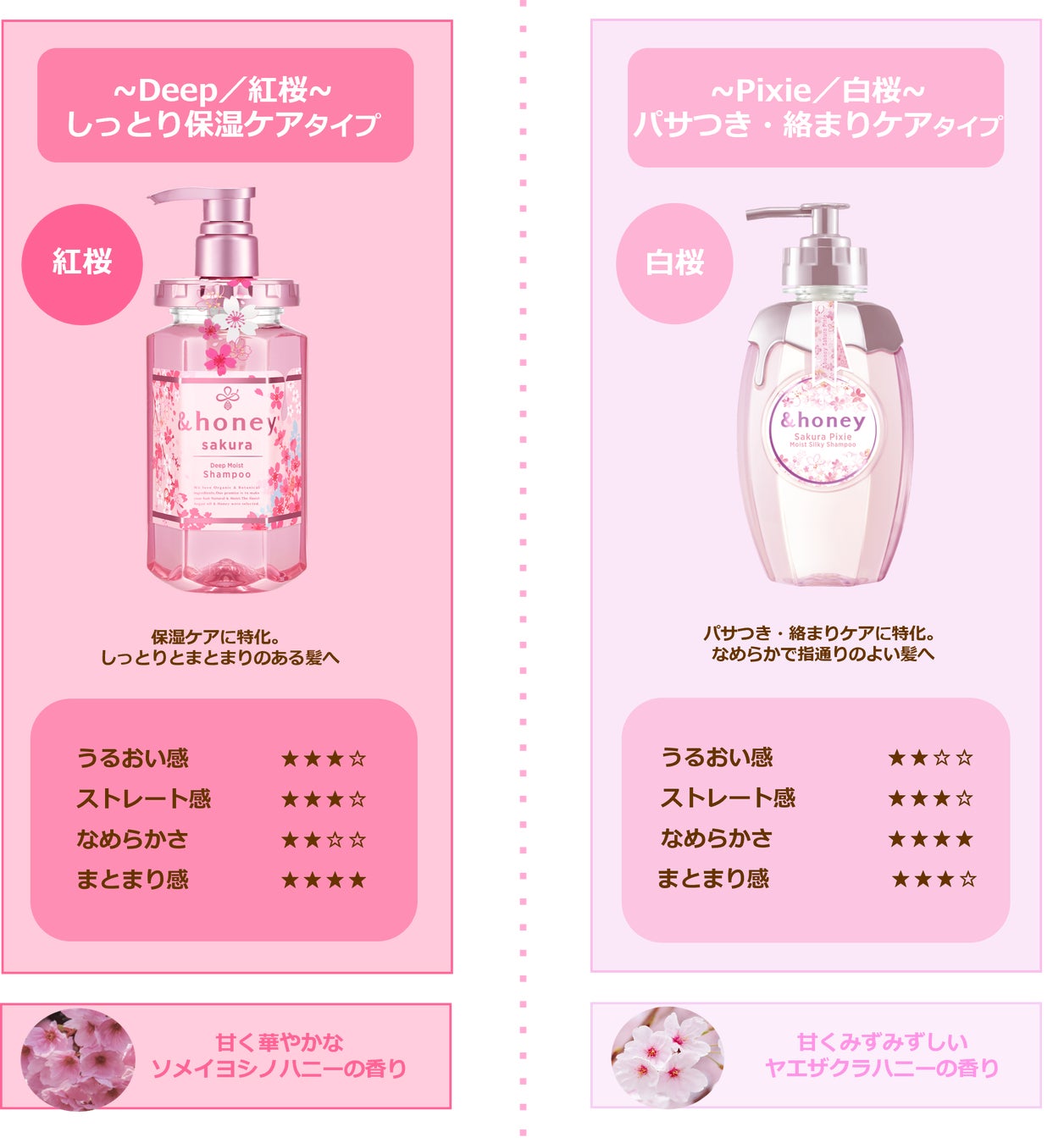 &honey Deepは紅桜をコンセプトとしたソメイヨシノハニーの香り、&honey Pixieは白桜をコンセプトとしたヤエザクラハニーの香りで、お好みの桜シリーズをお選びいただけます。
