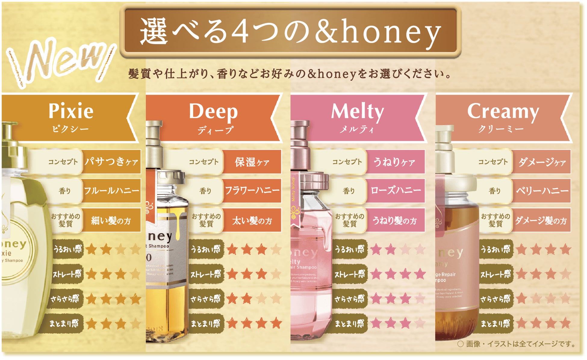厳選した3種のハチミツ*1を配合し、ハチミツ*1の保水力に加えてそれぞれ髪のお悩み別で展開しているアンドハニーシリーズ。 しっとり保湿ケアタイプの『&honey Deep(アンドハニー ディープ)』は、潤ってまとまりのある仕上がりに。パサつき・絡まりケアタイプの『&honey Pixie(アンドハニー ピクシー)』は、サラサラで指通りのよい仕上がりへと導きます。ご自身の髪の悩みやお好みに合わせてお選びいただけます。