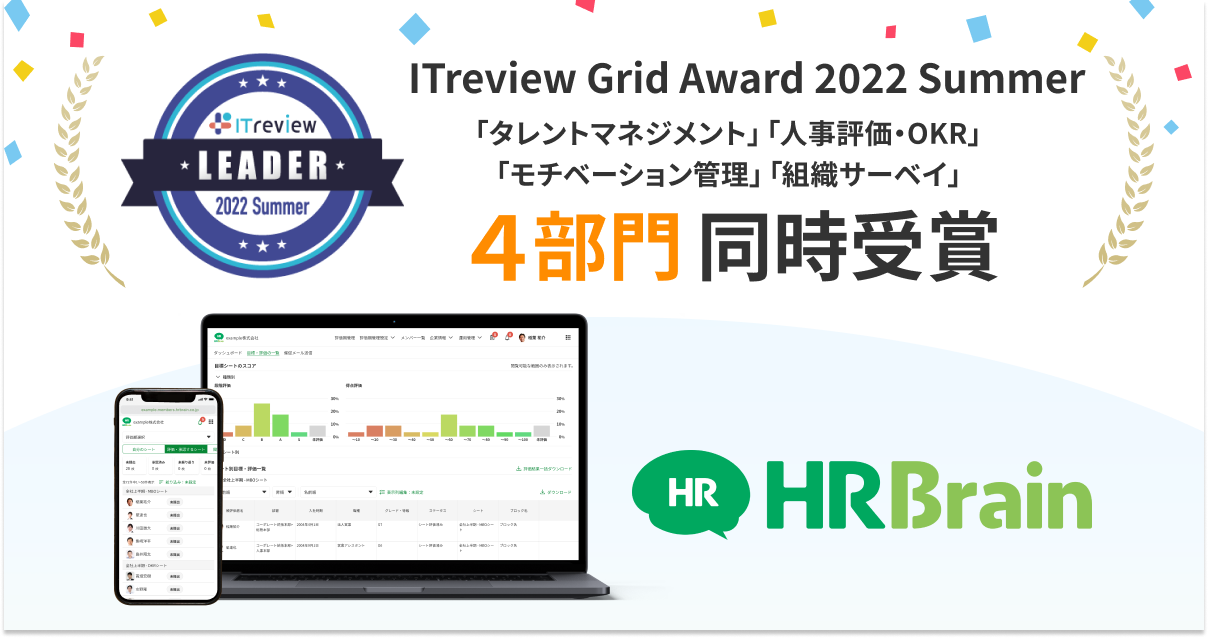 「HRBrain」が「ITreview Grid Award 2022 Summer」にて「Leader」をタレントマネジメント部門をはじめとする4部門で受賞