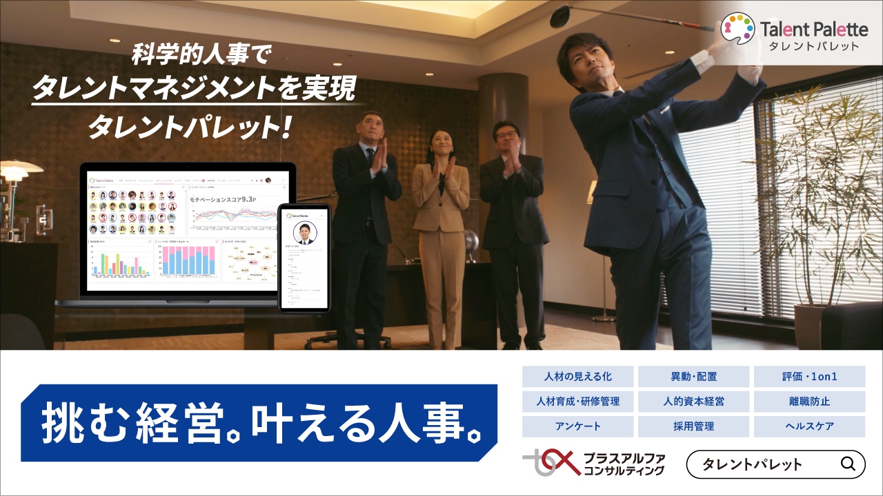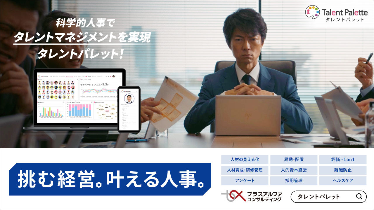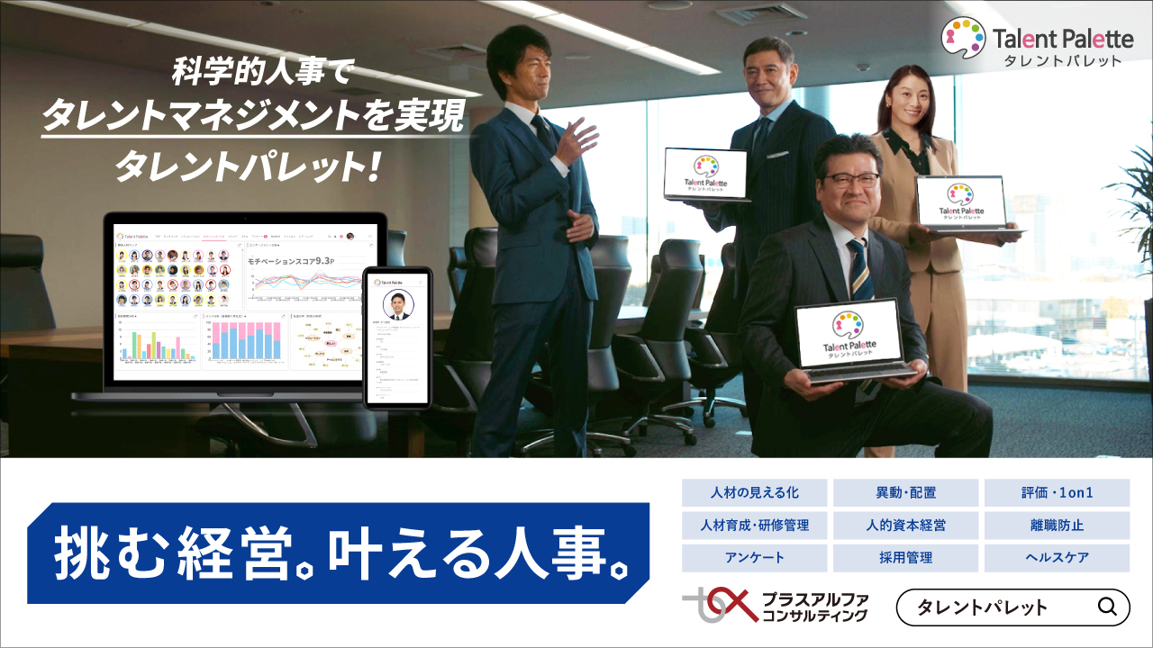 株式会社プラスアルファ・コンサルティング(本社:東京都港区、代表取締役社長:三室克哉、証券コード:4071)が提供する、人的資本経営やリスキリング、ジョブ型雇用、人事DXなどを背景に多くの企業で採用されている タレントマネジメントシステム「Talent Palette(以下:タレントパレット)」は、小池栄子さん、杉本哲太さん、佐藤二朗さん演じる人事戦略チームが、新たに加わった社長役の仲村トオルさんとともに新たな経営課題の解決に挑む、CMの新シリーズを3月22日より放映開始します。
