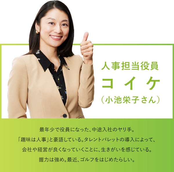 本CMでは、小池栄子さん、杉本哲太さん、佐藤二朗さん演じる人事戦略チームが仲村トオルさん演じる社長と「人的資本経営」「ジョブ型雇用」「リスキリング」など、中長期的な経営戦略に必要な人材活用とのギャップに直面しながら、経営・人事のビジョンを叶えるタレントマネジメントシステム「タレントパレット」で解決していくストーリーとなっています。