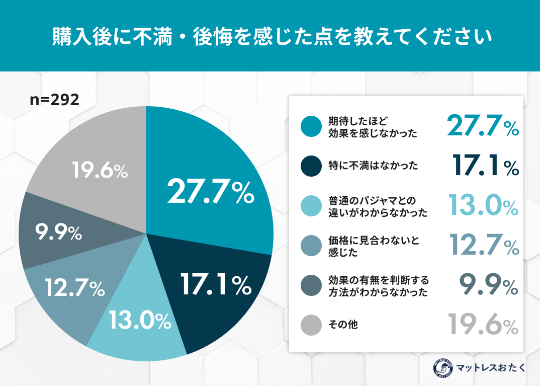 購入後の不満1位は「期待したほど効果を感じなかった(27.7%)」。 加えて「普通のパジャマとの違いがわからない」といった声も