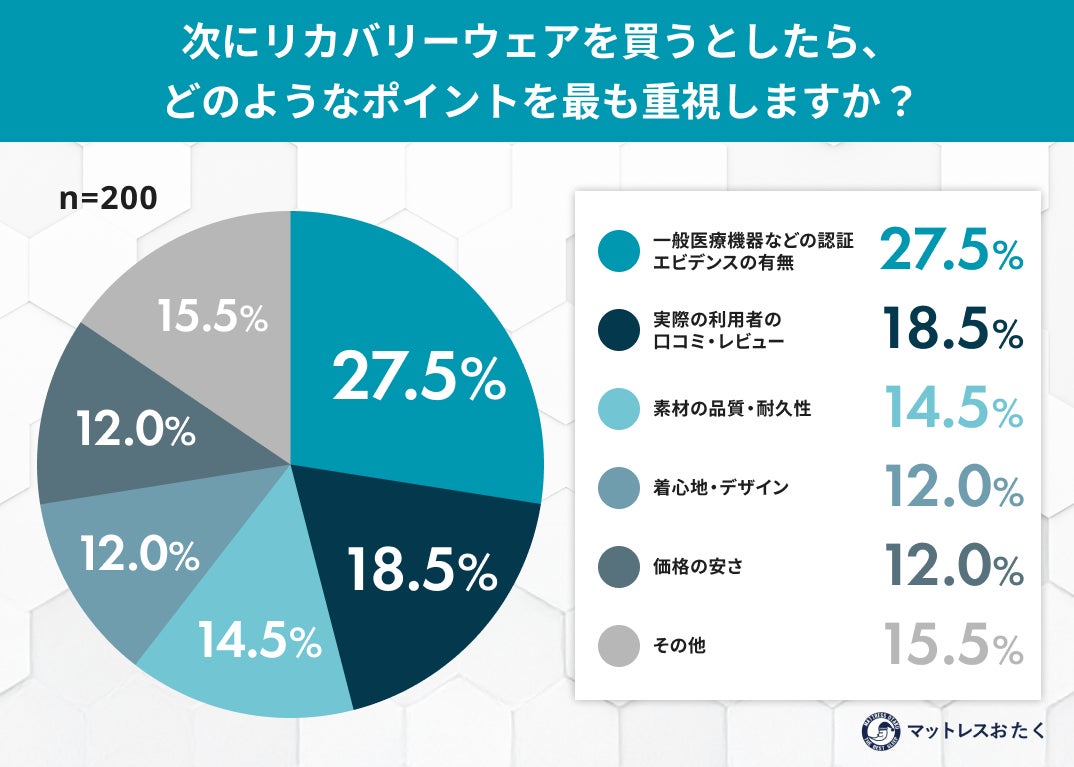 今回の調査で、リカバリーウェア選びにおける「V字の意識変化」が明らかになりました。 多くの購入者が、最初は「失敗しても痛くない価格帯」からエントリーしますが、その結果として「効果がよく分からない」「パジャマと変わらない」という落とし穴にはまってしまいます。しかし、そこで諦めるのではなく、次の1枚には「一般医療機器」などの公的な認証や確かなエビデンスを求めるようになるという、より本質的な製品選びへのシフトが見て取れます。リカバリーウェアは単なる服ではなく「コンディショニングツール」です。後悔しないためには、最初から客観的な指標に基づいた製品選びをすることが、結果として最もコストパフォーマンスが高いと言えるでしょう。