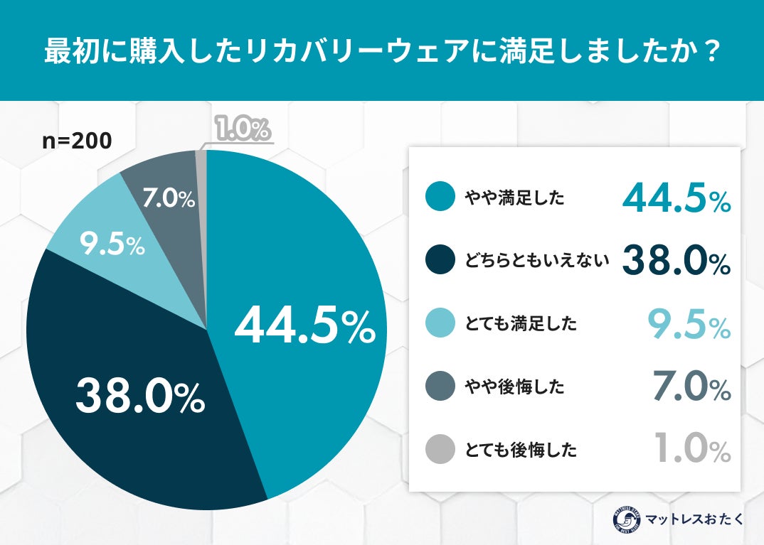 「着るだけで疲労回復をサポートする」として、アスリートからビジネスパーソンまで急速に普及しているリカバリーウェア。市場の拡大に伴い、安価な製品も増え手に取りやすくなった一方で、「本当に効果があるのか?」「普通のパジャマと何が違うのか?」という疑問の声も少なくありません。「マットレスおたく」を運営するムーンムーン株式会社は、リカバリーウェア購入経験者200名を対象に「最初のリカバリーウェア選びと満足度」に関する実態調査を実施しました。その結果、満足している層も一定数いるものの、約4割が「効果の実感」という壁に突き当たっている、リカバリーウェア選びの“落とし穴”が浮き彫りになりました。