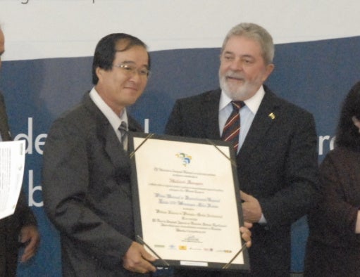 (画像はCAMTAを代表してルラ大統領(当時)より表彰を受ける理事(当時)の小長野道則氏)