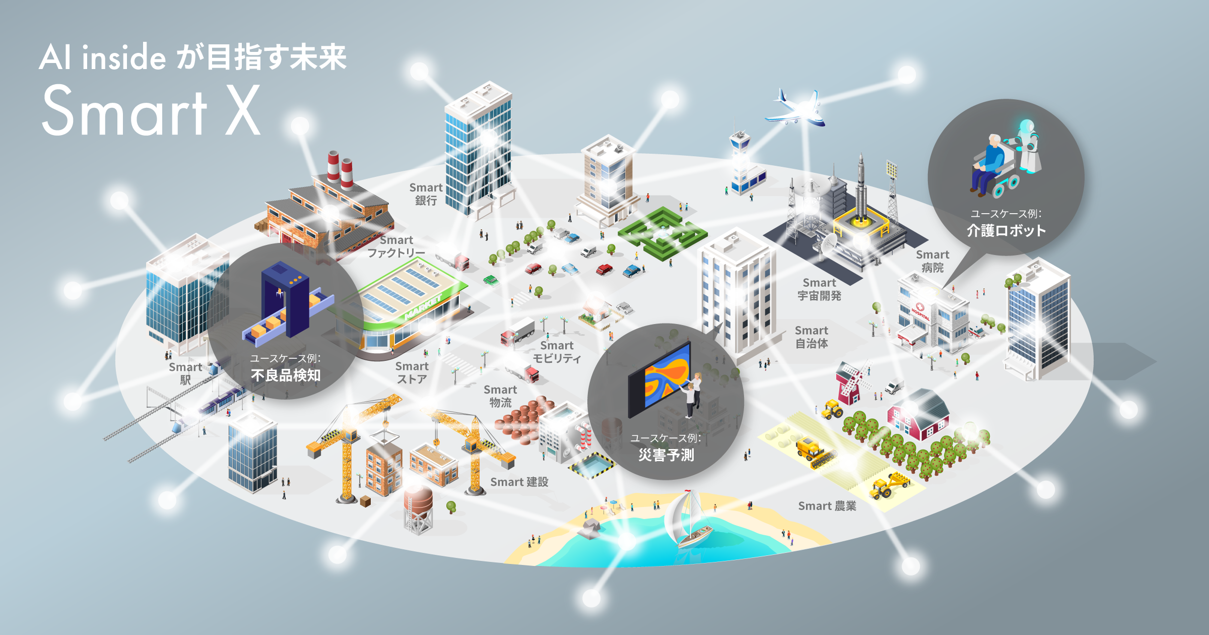 AI inside は「世界中の人・物にAIを届け、豊かな未来社会に貢献する」というミッションのもと、AIを作る・使う「Learning Center」「AMATERAS RAY」、AIを動かす「AI inside Cube」、あらゆる情報を高精度にデジタルデータ化する「DX Suite」、実践型AI教育プログラム「AMATERAS EDU」を提供しています。AI inside は、これらAIプラットフォームの提供を通じ、多種多様な価値あるAIの分散的な創出とユーザ間のシェアを促すことで、AIが隅々まで拡がった社会の実現を目指します。