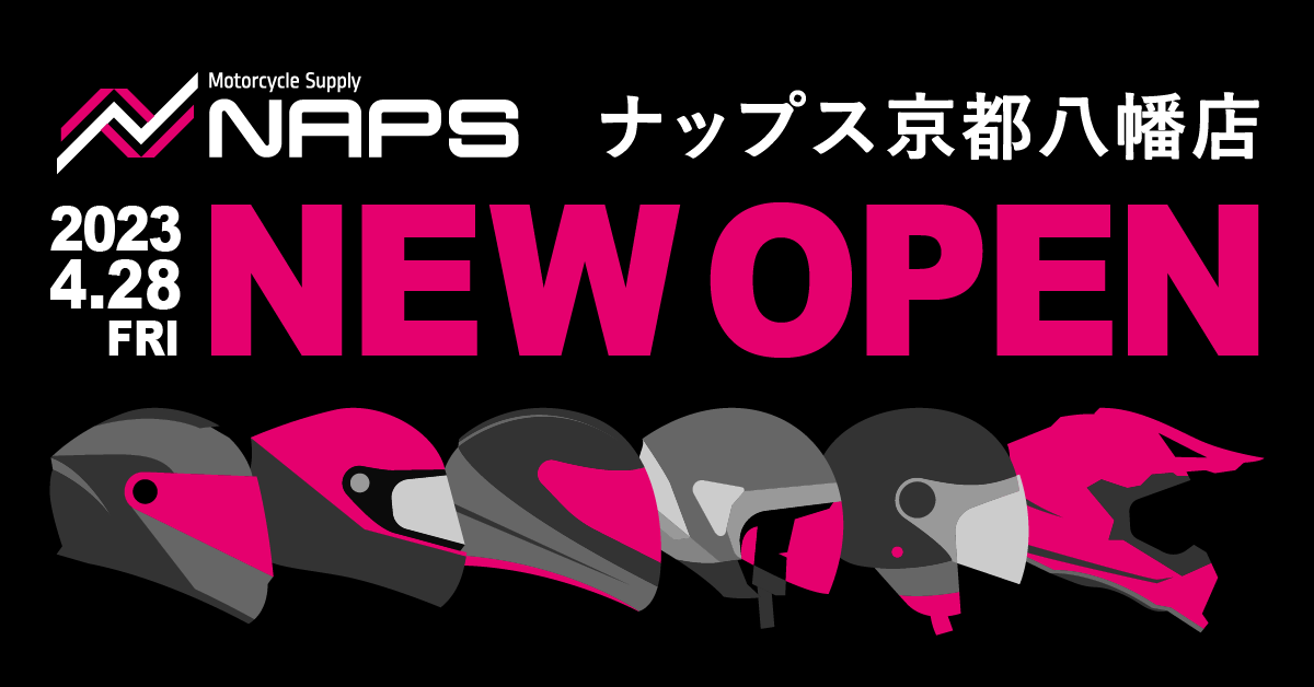 オートバイ用品の小売・開発を行う株式会社ナップス(本社:神奈川県横浜市、代表取締役:望月 真裕)は、オートバイ用品店「ナップス京都八幡店」(所在地:京都府八幡市美濃山ヒル塚31−1)につきまして2023年4月28日(金)にオープンすることをお知らせいたします。今回の「ナップス京都八幡店」の出店により、ナップス店舗は国内外合わせ合計34拠点になります(開店予定の堺インター店、中古バイク用品買取販売「アップガレージライダース」6店舗含む)。