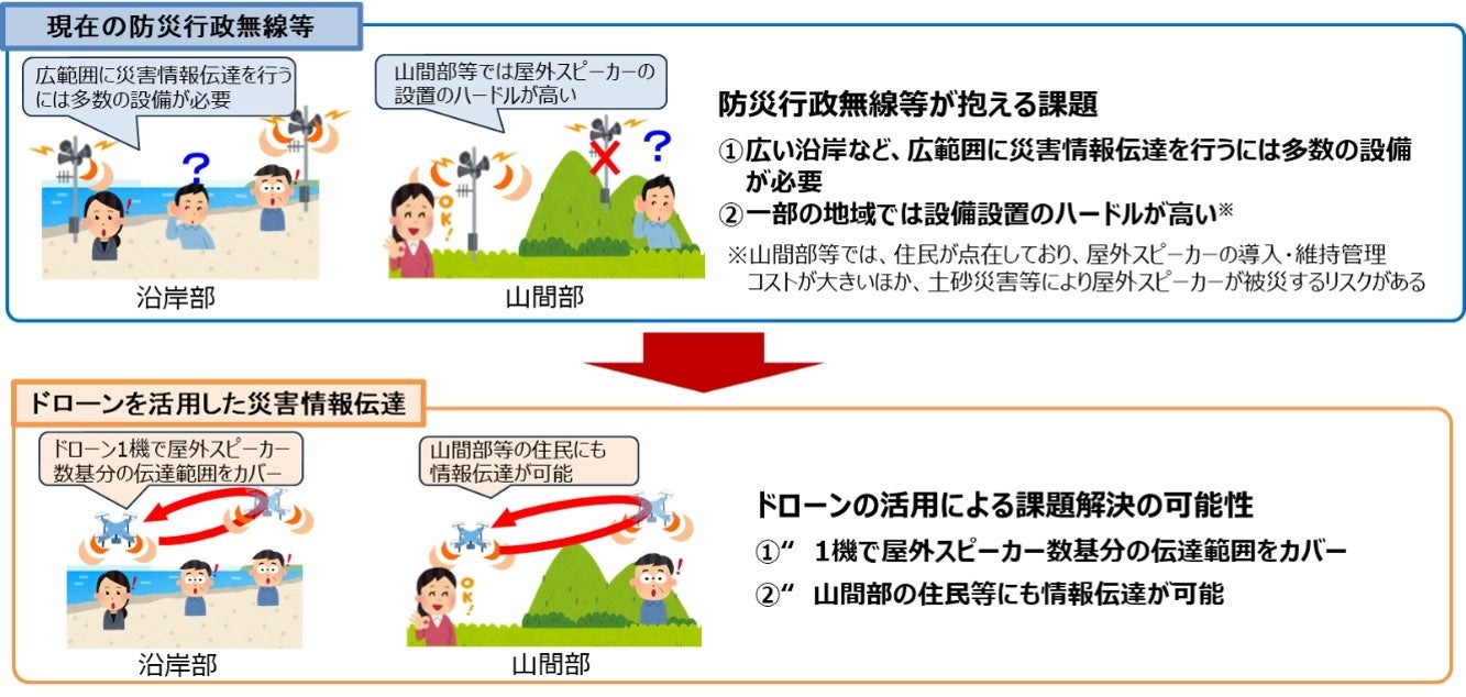 本事業では、災害時に住民へ迅速かつ確実に情報を伝達する手段として、スピーカーを搭載したドローンを防災行政無線等の補助手段として活用する際の留意事項や必要な要件の整理を行いました。