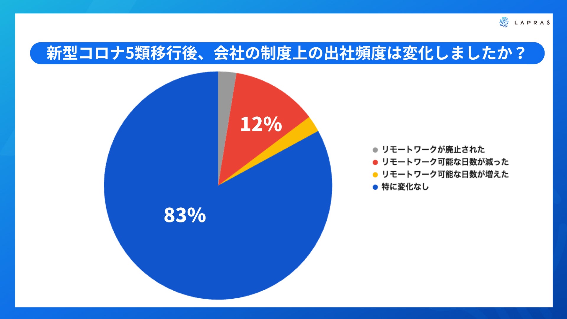約8割が変化はなし、約1割はリモートワークできる日数が減少したと回答。大きな変化はないことがわかりました。