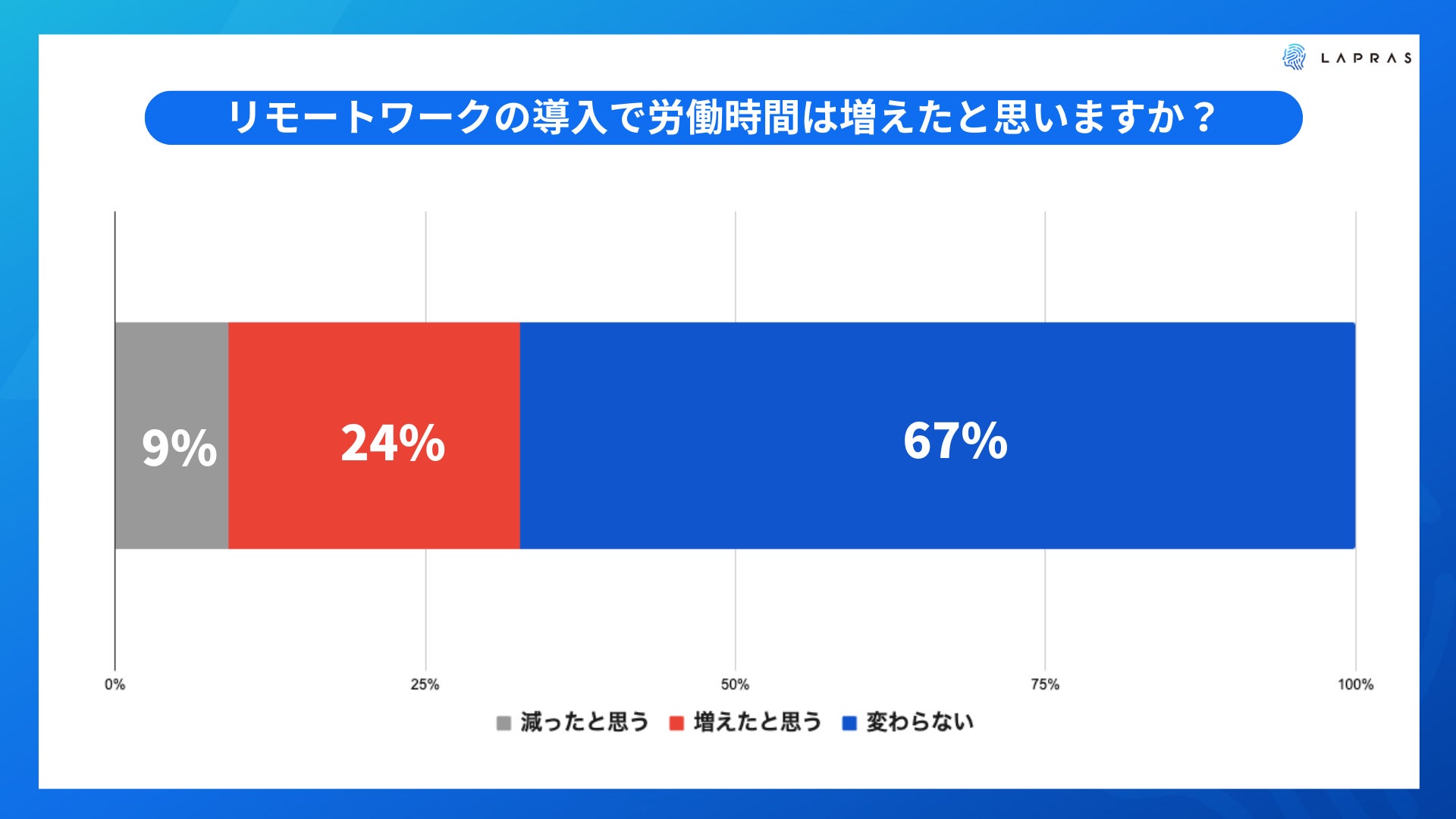 約7割が変わらないと回答したが、2割程度は労働時間が増えたと回答。一部の方には労働時間が増えるきっかけになっていることがわかりました。
