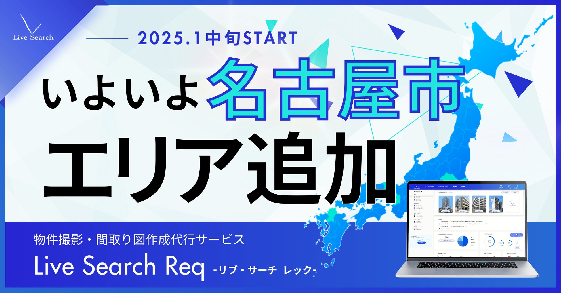 不動産会社向けに物件写真撮影・間取り図作成代行クラウドサービスを開発・運営する株式会社Live Search(本社:福岡県福岡市中央区、代表取締役:福井 隆太郎/以下、「リブ・サーチ」)は、2025年1月中旬を目処に、愛知県名古屋市全域の16区を撮影エリアに追加しサービスを展開することを決定いたしました。