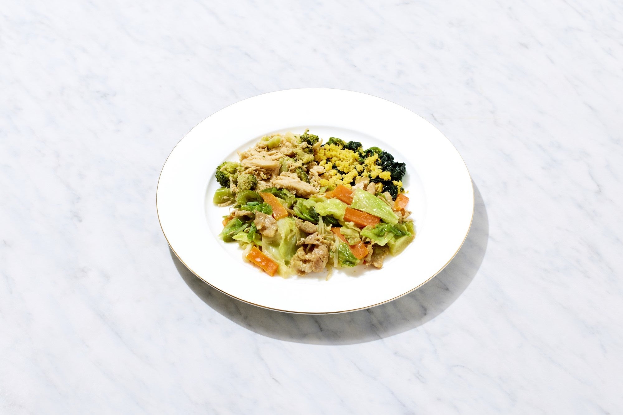 野菜をシッカリ摂れるメニューの定番、肉野菜炒めが登場です。しっかり豚バラ肉も入って野菜だけで物足りないということはありません。ダイエット中でも満足の一品です。副菜はほうれん草と玉子のソテーとブロッコリーと蒸し鶏の温サラダ、野菜もタンパク質も一気に摂れる一石二鳥のセットです。