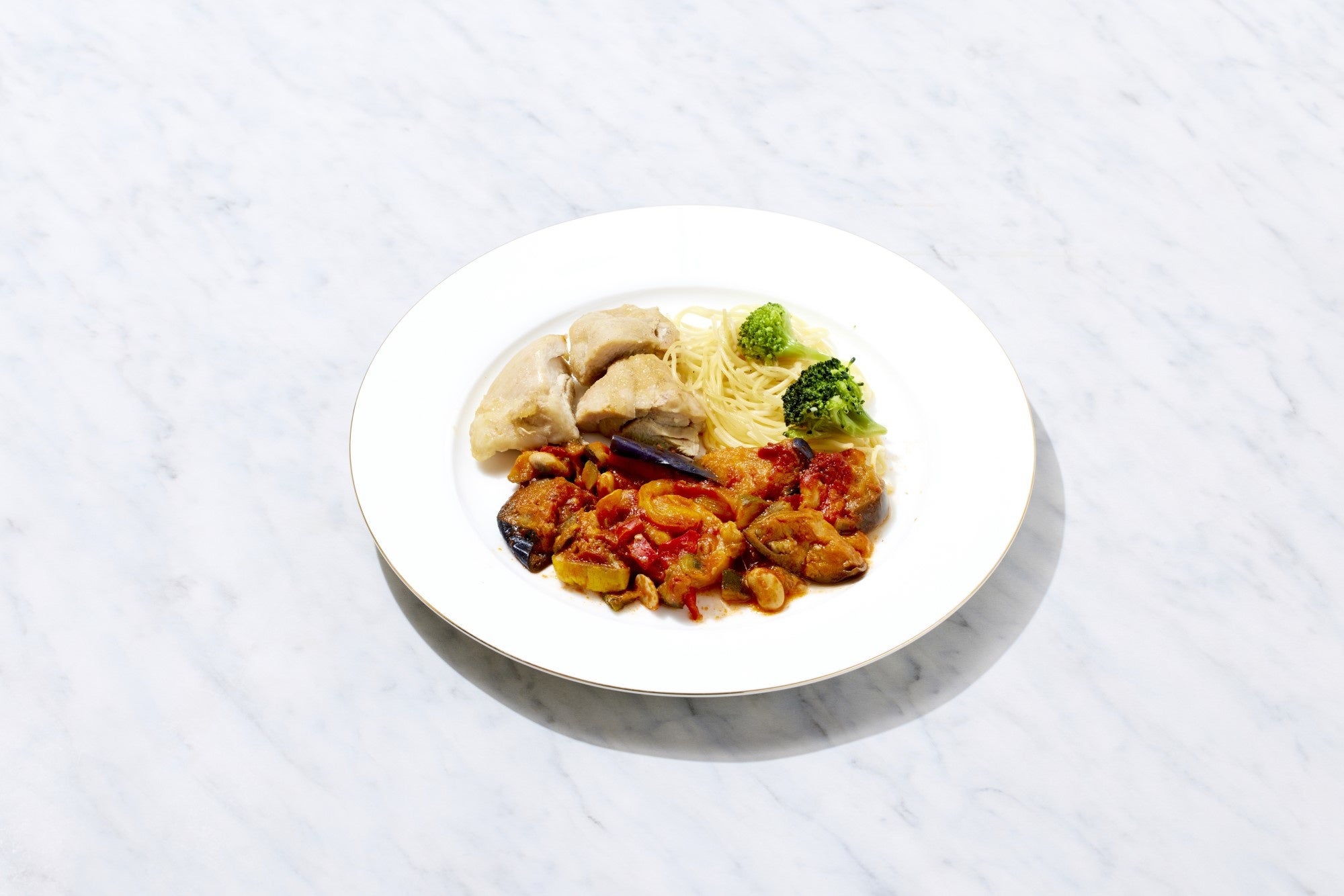 色の濃い野菜を食べてますか?トマトたっぷりのラタトゥイユセットが低糖質メニューに加わりました。緑と黄色のズッキーニ、赤ピーマン、黄ピーマンを真っ赤なトマトで煮込んだラタトゥイユならお手軽に野菜を摂れます。副菜はローストチキンをさっぱりと和風ソースで。糖質を抑えたパスタでお腹も大満足です。