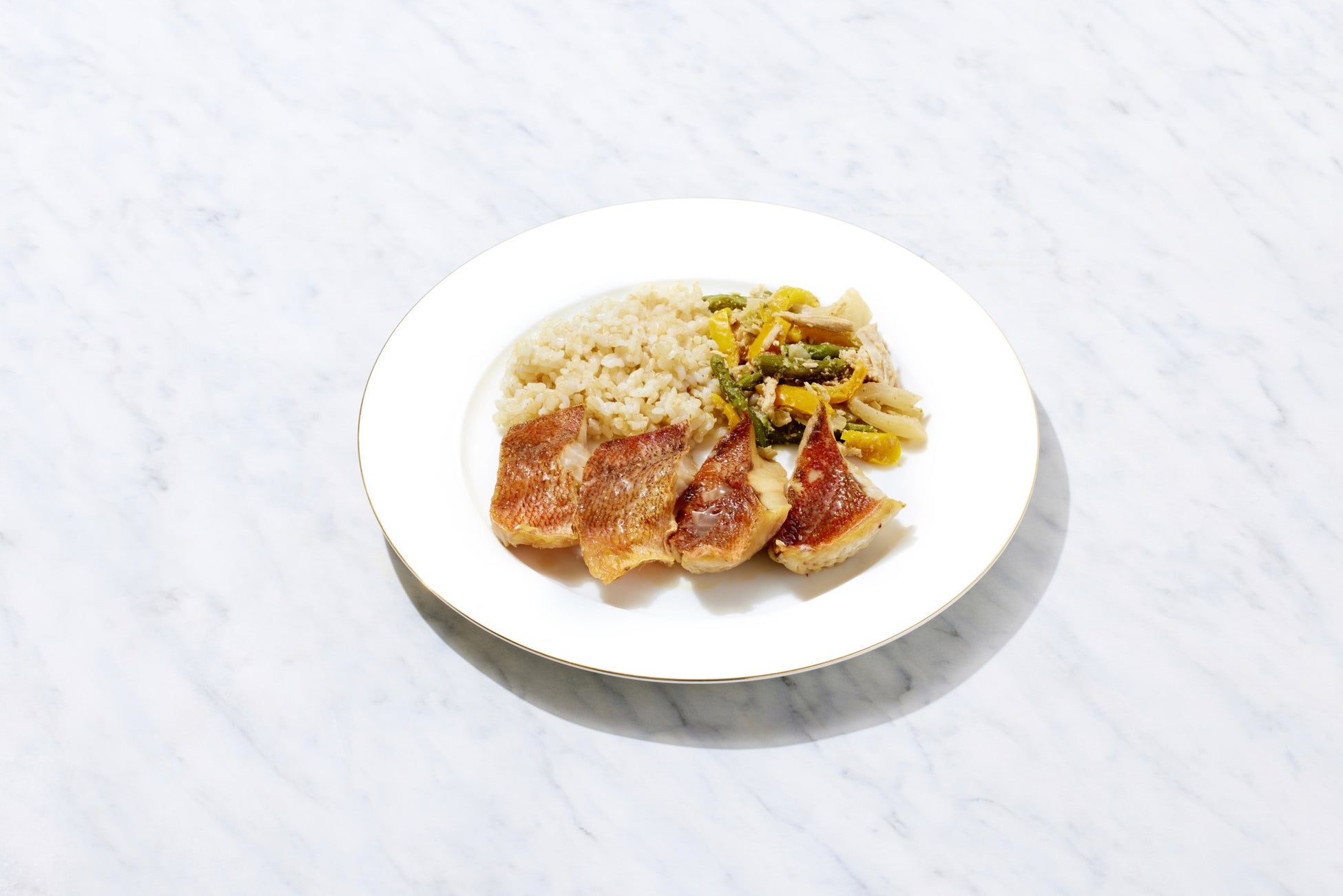 高たんぱく低脂質な赤魚を、ふっくら甘辛く煮つけにしました。煮汁には生姜を効かせてコクがありながら、後味をキリっと引き締めております。副菜にはアスパラガスをたっぷりの蒸し鶏とゴマ風味のドレッシングで和えた和風温サラダです。