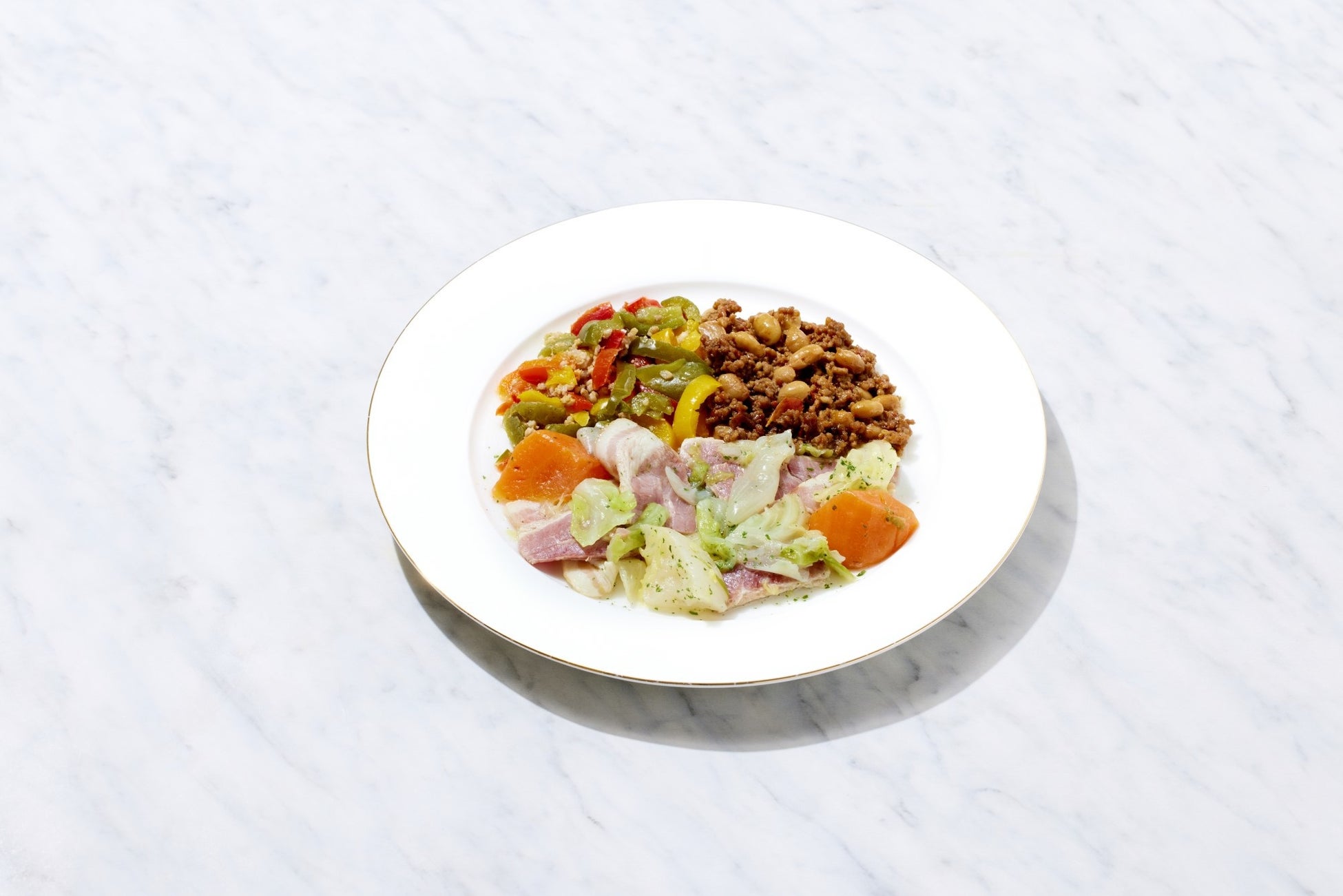 低糖質メニューにポトフが登場です。大きめにカットしたキャベツ、玉ねぎ、大根、人参を優しくコンソメ風味で煮込みました。副菜には3色のピーマンとひき肉のソテー。もう1品はピリッと辛みが美味しいチリビーンズです。