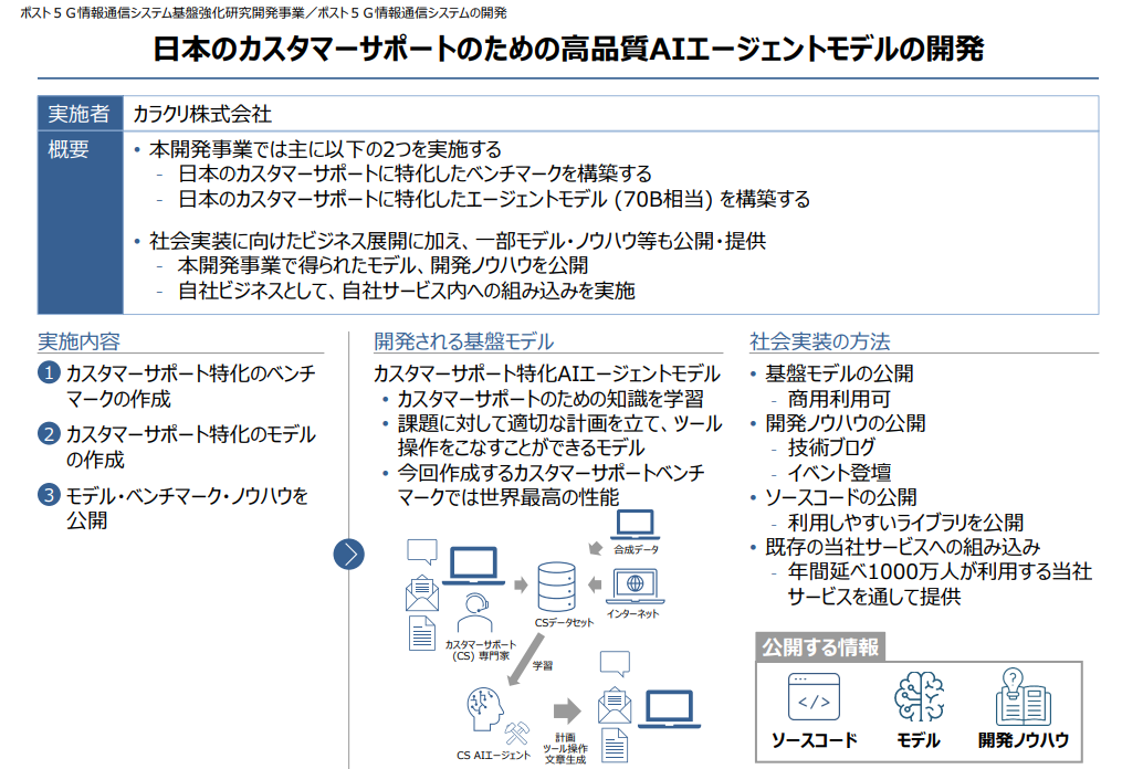 経済産業省と国立研究開発法人新エネルギー・産業技術総合開発機構(NEDO)は、生成AIの開発力強化に向けたプロジェクト「GENIAC」において、基盤モデルの開発に必要な計算資源の提供支援の第2期と、ユニークなデータに基づく開発と利活用を通じて得たデータをさらなるAIの高度化に繋げていく好循環の構築に向けたデータ実証を行います。カラクリは「日本のカスタマーサポートのための高品質AIエージェントモデルの開発」を実施し、国内市場において100万人が従事するといわれているコールセンター市場への生成AIの実装を加速してまいります。10月18日(金)14時40分からの本講演では、当社基盤モデルのご紹介およびユーザー企業から見たモーダル・領域の可能性についてお話する予定です。