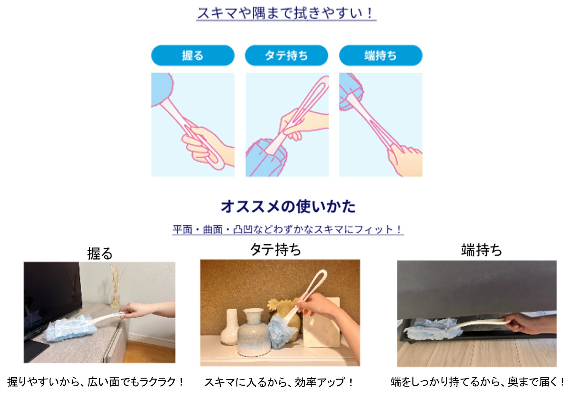 そこでこのたび、ホルダーのデザインを刷新し、手にフィットするループ形状で家中のスキマの掃除を可能にする『ウェーブ ハンディワイパー』を発売します。