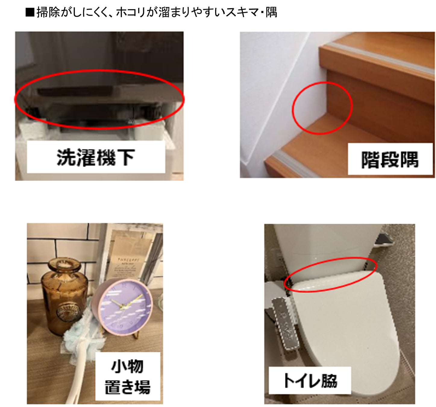 ・テレビ台などの広い面はもちろん、トイレの配線周りや階段の隅、小物の細かなスキマといった手の届きにくい場所にも対応。