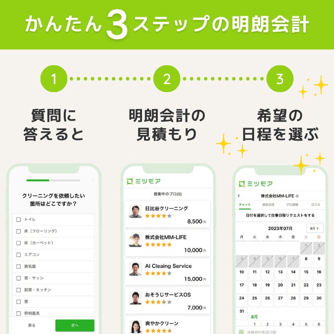 ミツモアでは以下の3ステップで希望日程に対応する業者を比較できるため、「予約が取れない」や「高すぎる料金」といった繁忙期の問題を解決します。チャットでやりとりし、ネット完結で予約まで完了できるので、忙しい時期でも安心です。