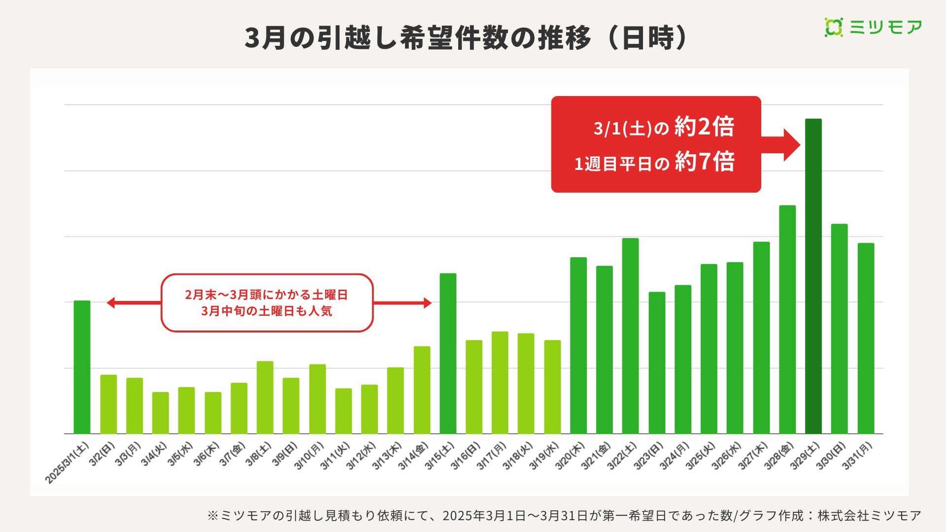 2025年3月1日〜31日の引越し希望件数を日ごとに見ると、最終土曜日である3月29日に最も多くの希望が集中していました。