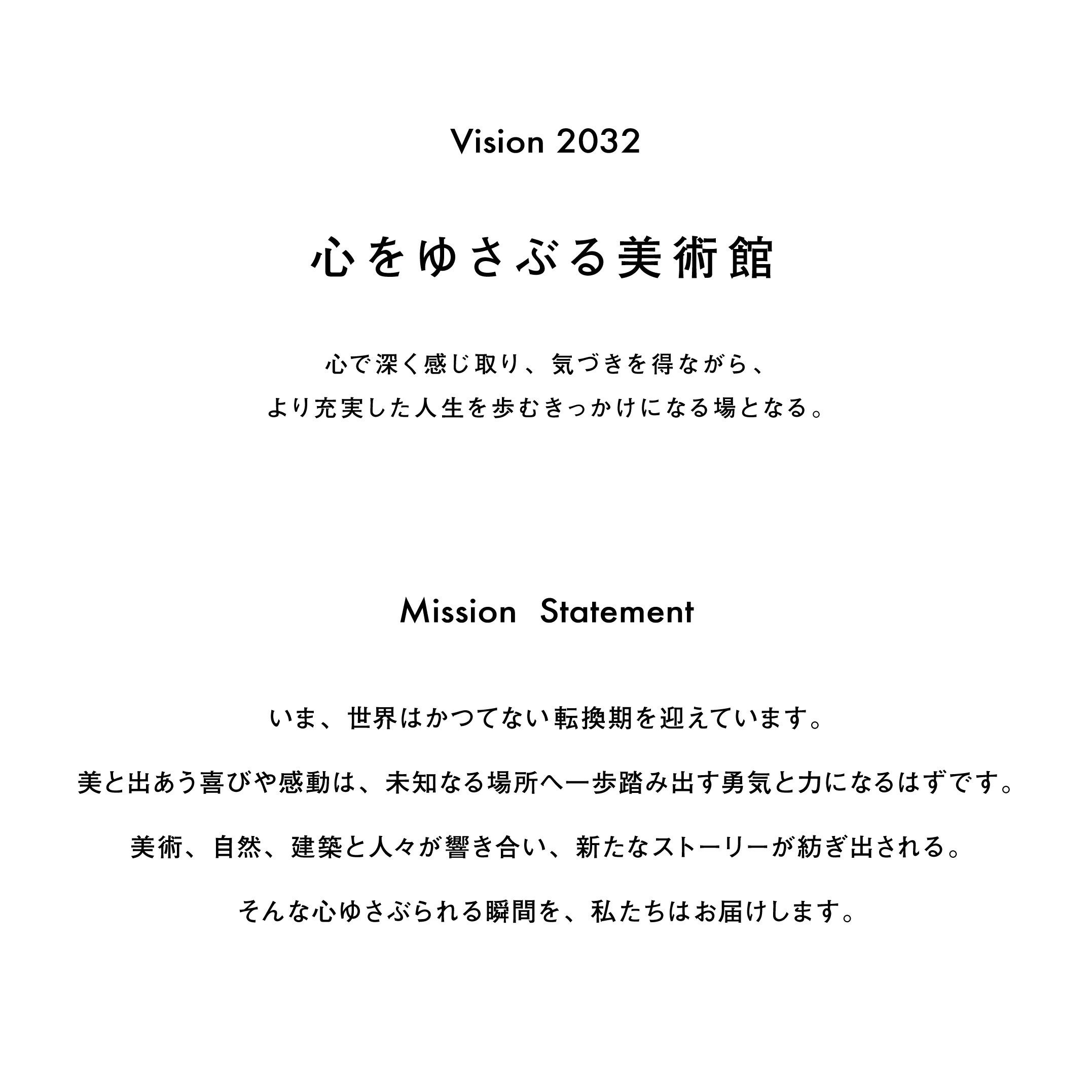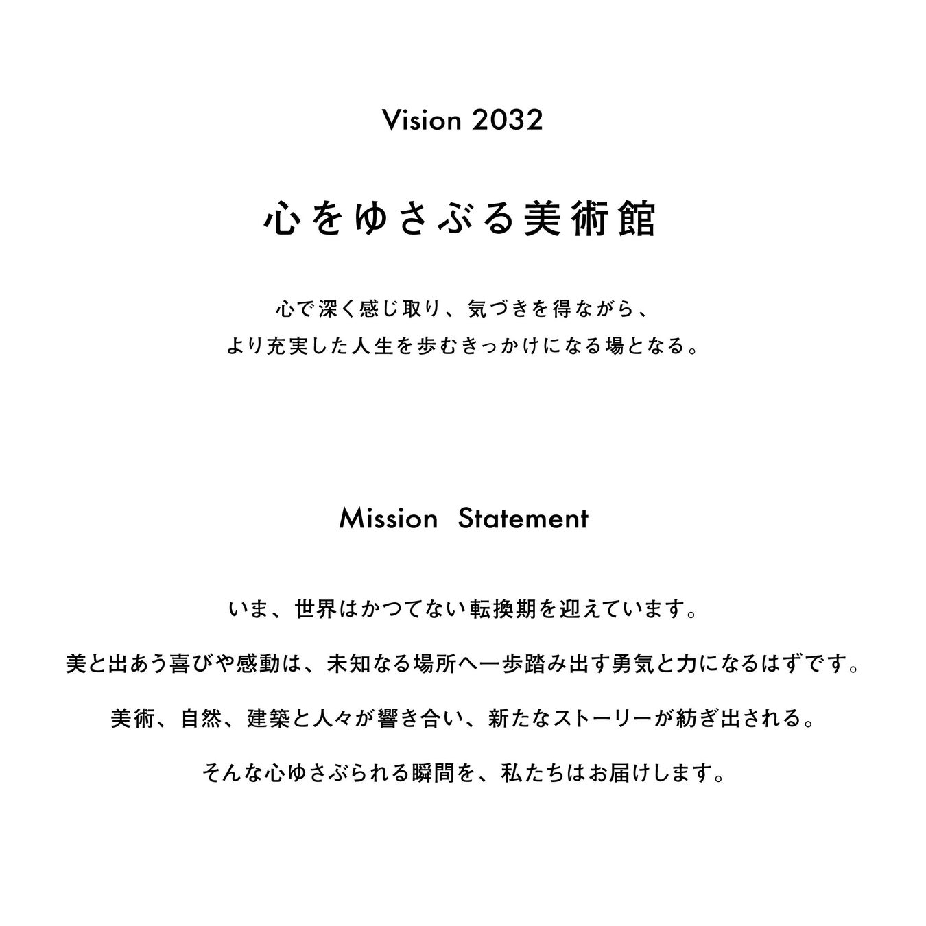 時代に寄り添いつつ、美術や自然、人間を通して多様な価値観や新しいものの見かたや考えかた、あるいは心に残る体験を提供する、開かれた出あいの場となるべく、当館をとりまくステークホルダーの皆さまとのコミュニケーションを通じて「心をゆさぶる」瞬間を共創してまいります。