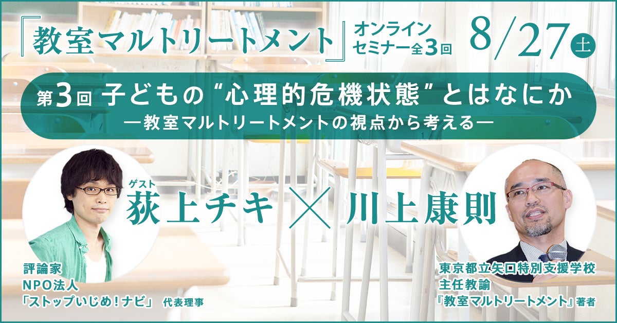 最終回のゲストは、本書の帯にもコメントを寄せてくださった、評論家で「ストップいじめ!ナビ」代表理事の荻上チキさんをお招きし、「心理的危機状態」とはなにか、子どもたちをそのような状態に追い込まないために心がけたいことはどのようなことか、丁寧に考えていきます。