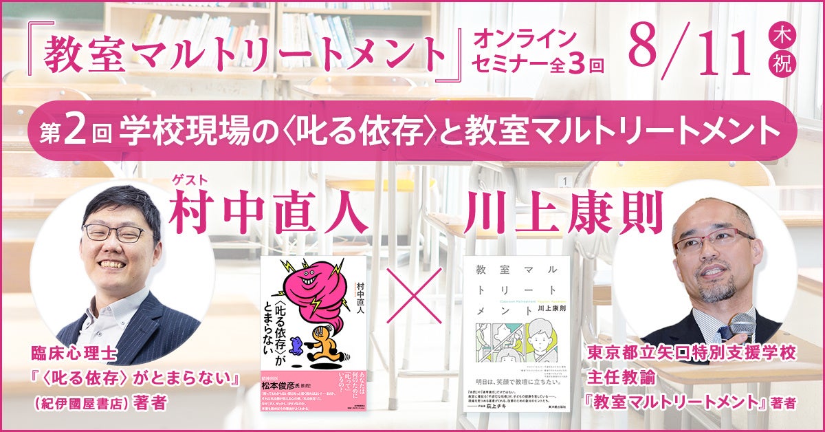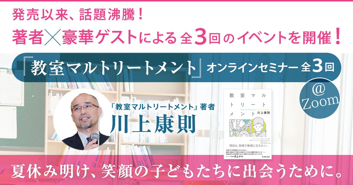刊行以来、大きな反響をいただいている川上康則(東京都立矢口特別支援学校主任教諭)著『教室マルトリートメント』。教室で行われる、子どもの心を傷つけるような不適切な指導を表すこの言葉に関して、各専門家の多様な視点から深掘りするセミナーを、全3回開催いたします。ゲストとのディスカッションのほか、参加者のみなさまからの疑問にもお答えしながら、子どもたちとともに教師自身も安心した毎日を送るための方法を考えます。