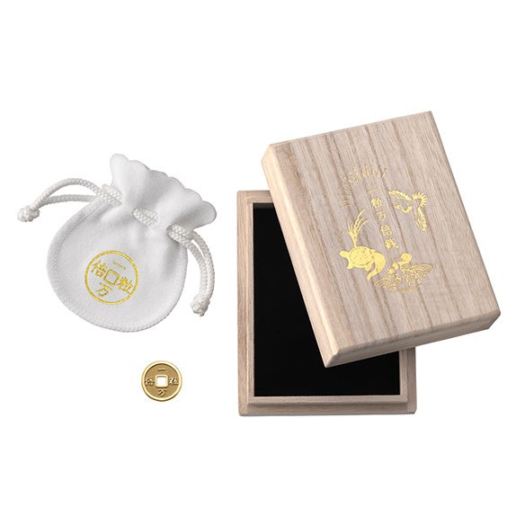 2022年に発売した「純金 一粒万倍銭 1g」が好評だったことから要望が多かった「純金 一粒万倍銭 5g」を2023年より販売開始しました。お出かけの際にも持ち歩きやすい、一粒万倍銭を収めるポーチ付きです。