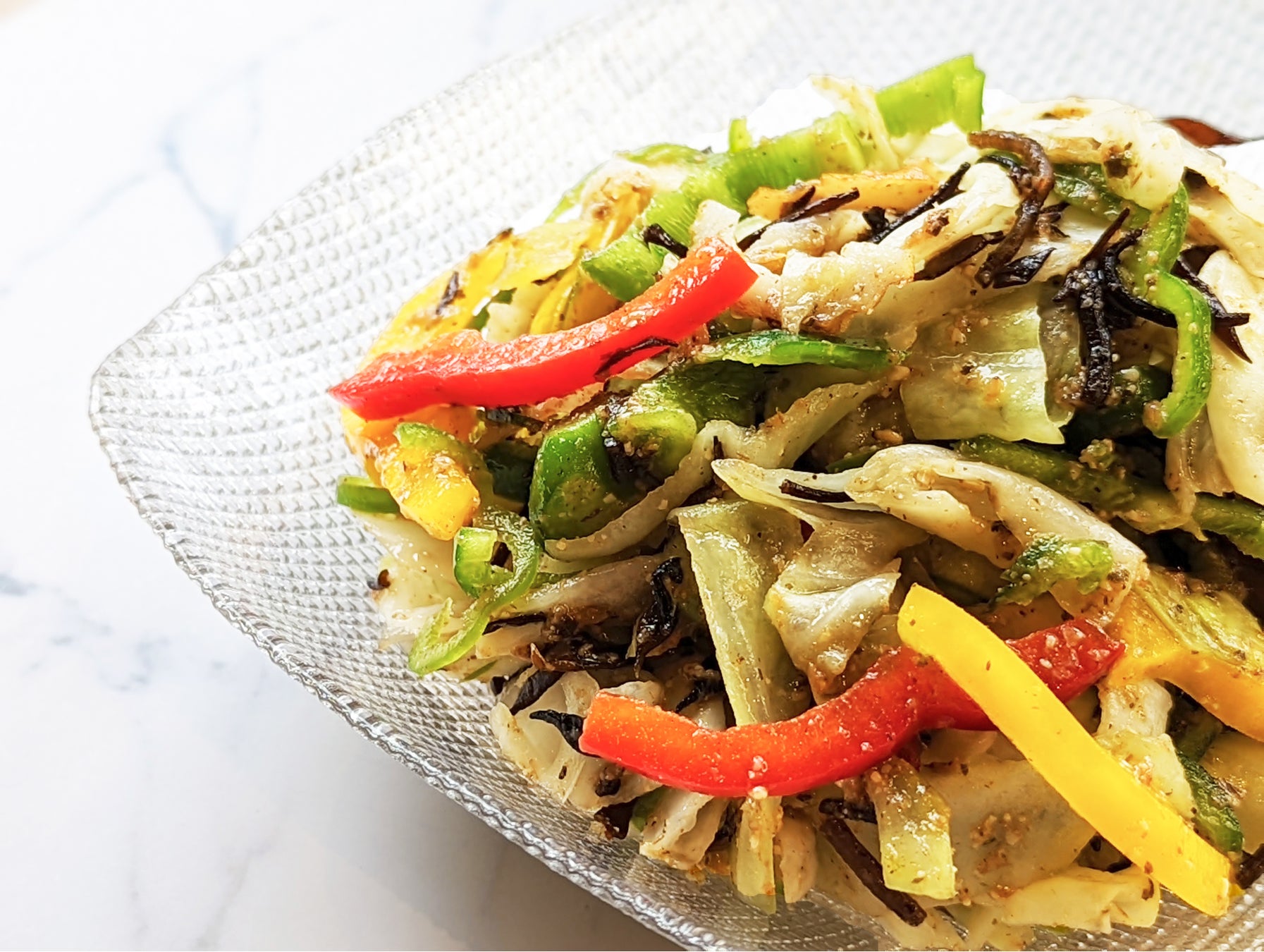 ピーマン・赤・黄パプリカの3色のピーマンが主役!香ばしいゴマのコクと梅の爽やかなソースにより、味わい深く食べやすいサラダです。ピーマンが苦手な方にも、お試しいただきたい一品です。