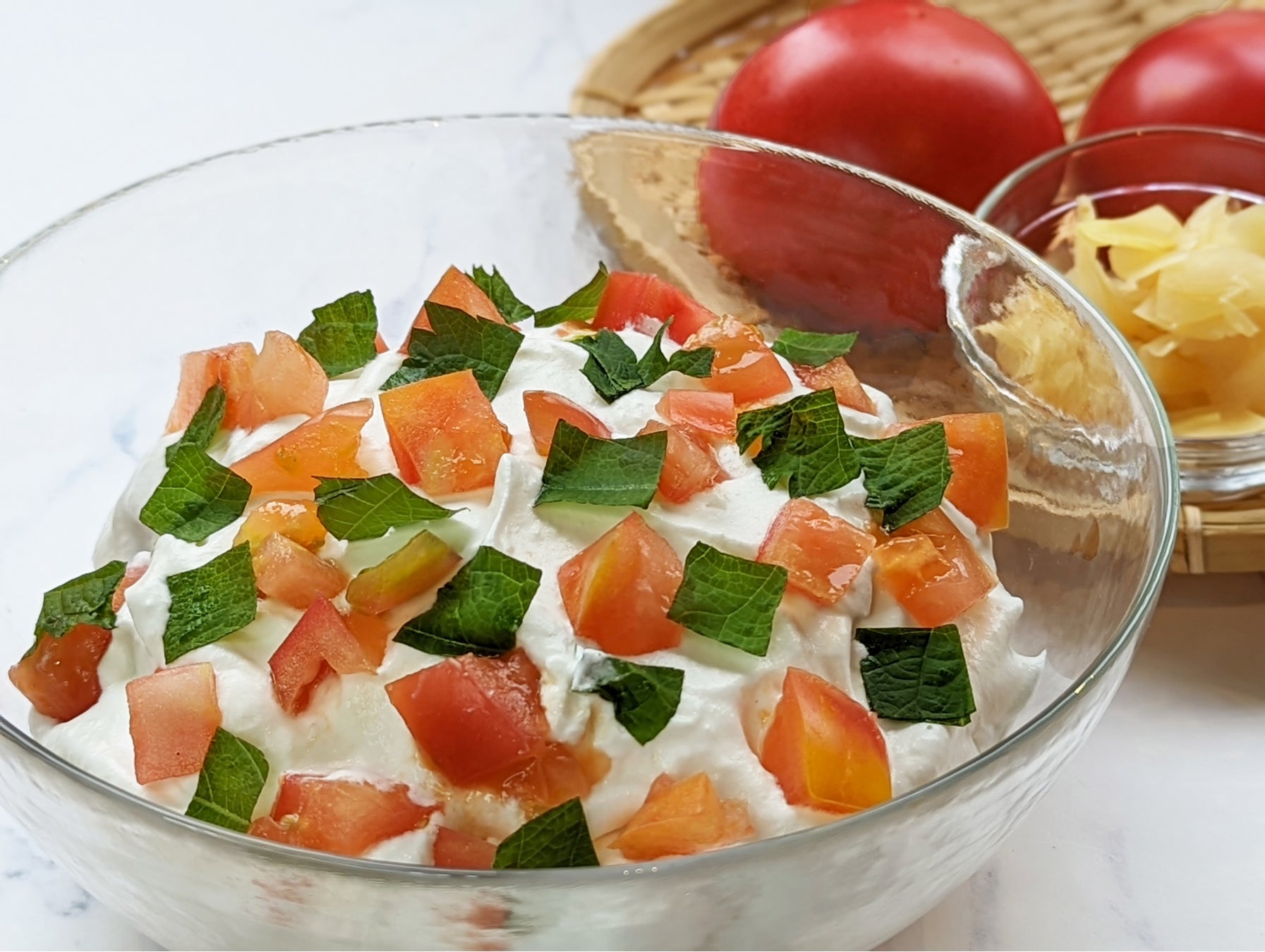 口に入れると、生クリームとヨーグルトをたっぷりと使用したふわふわの塩麴クリームが溶け出し、豆富を優しく包み込みます。甘酸っぱいガリやトマトでさっぱりとした後味の、新感覚な豆富のサラダです。