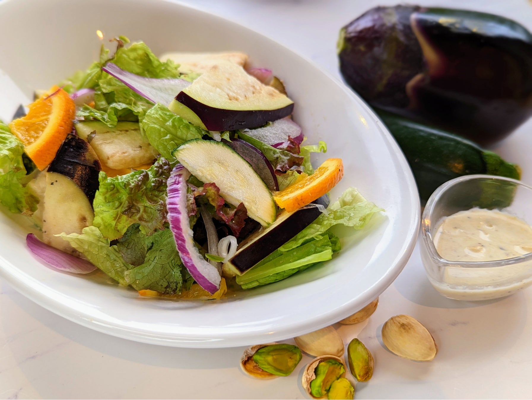 生でも食べられる、やわらかな水なすがたっぷり!水なすの甘みと、香ばしくまろやかなピスタチオヨーグルトソース、フルーティーなオレンジが奏でるハーモニーをお楽しみください!