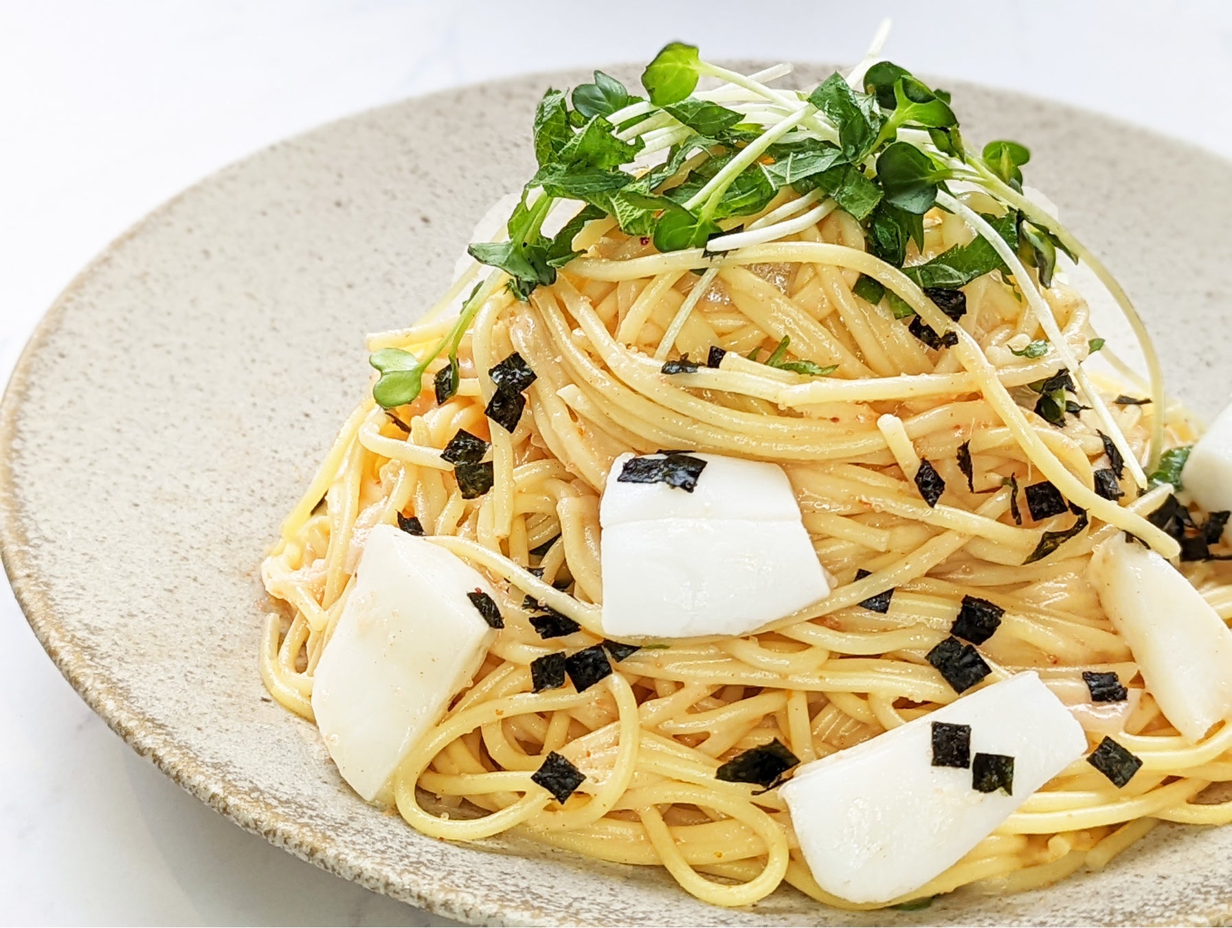 ピリッとした明太子と豆乳のコクのあるクリームソースが見事にマッチ!大葉のさわやかな香りが食欲をかき立てます。