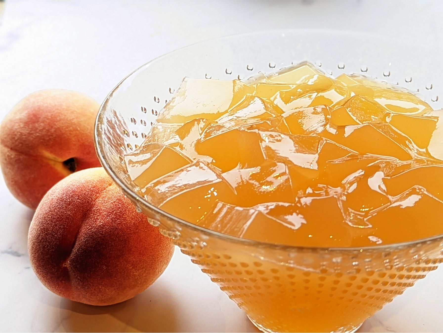 ジューシーな白桃風味で、隠し味に紅茶を入れた、すっきりとした甘みのゼリーです。