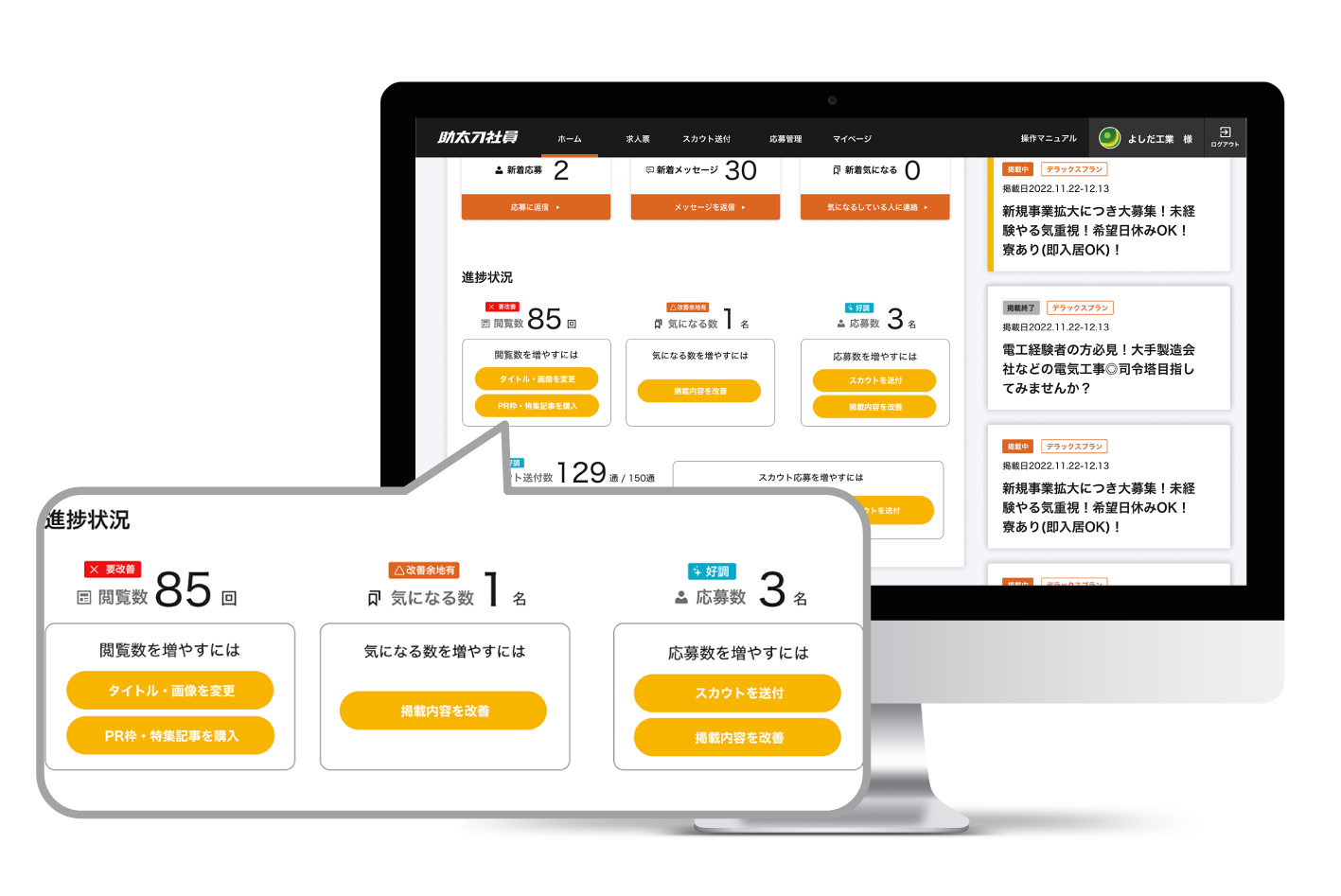 これにより掲載求人への反応や進捗状況の確認、改善の分析を求人掲載企業様が自社で行うことができ、よりスムーズな応募者対応が可能になります。