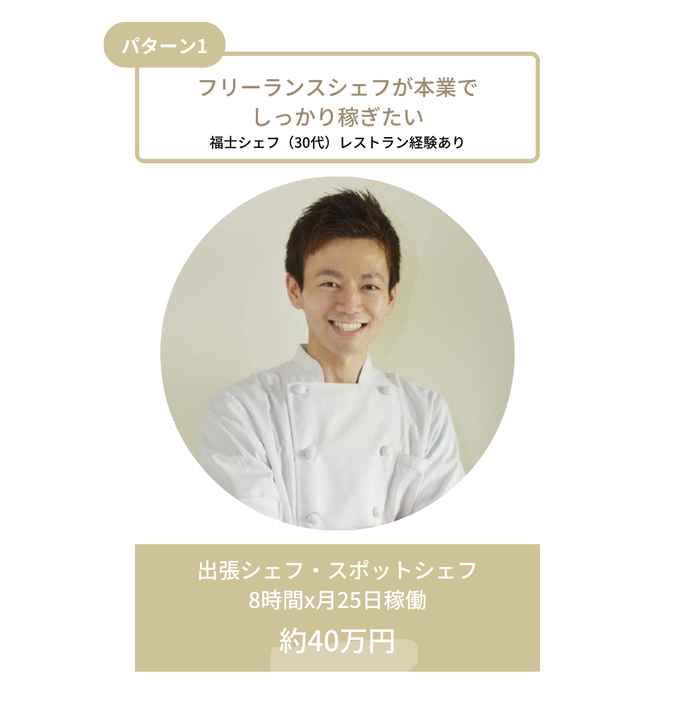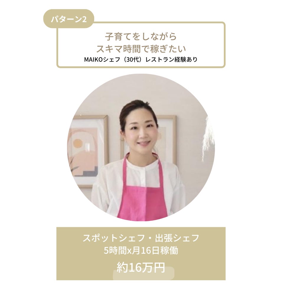 スポットシェフ、出張シェフを半々でおこない1日5時間x月16日稼働し月収約16万円を稼ぐシェフも在籍しています。