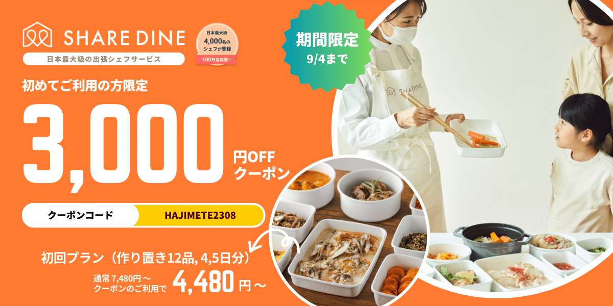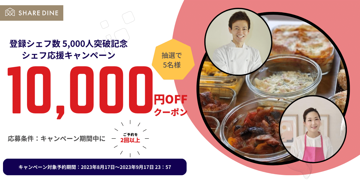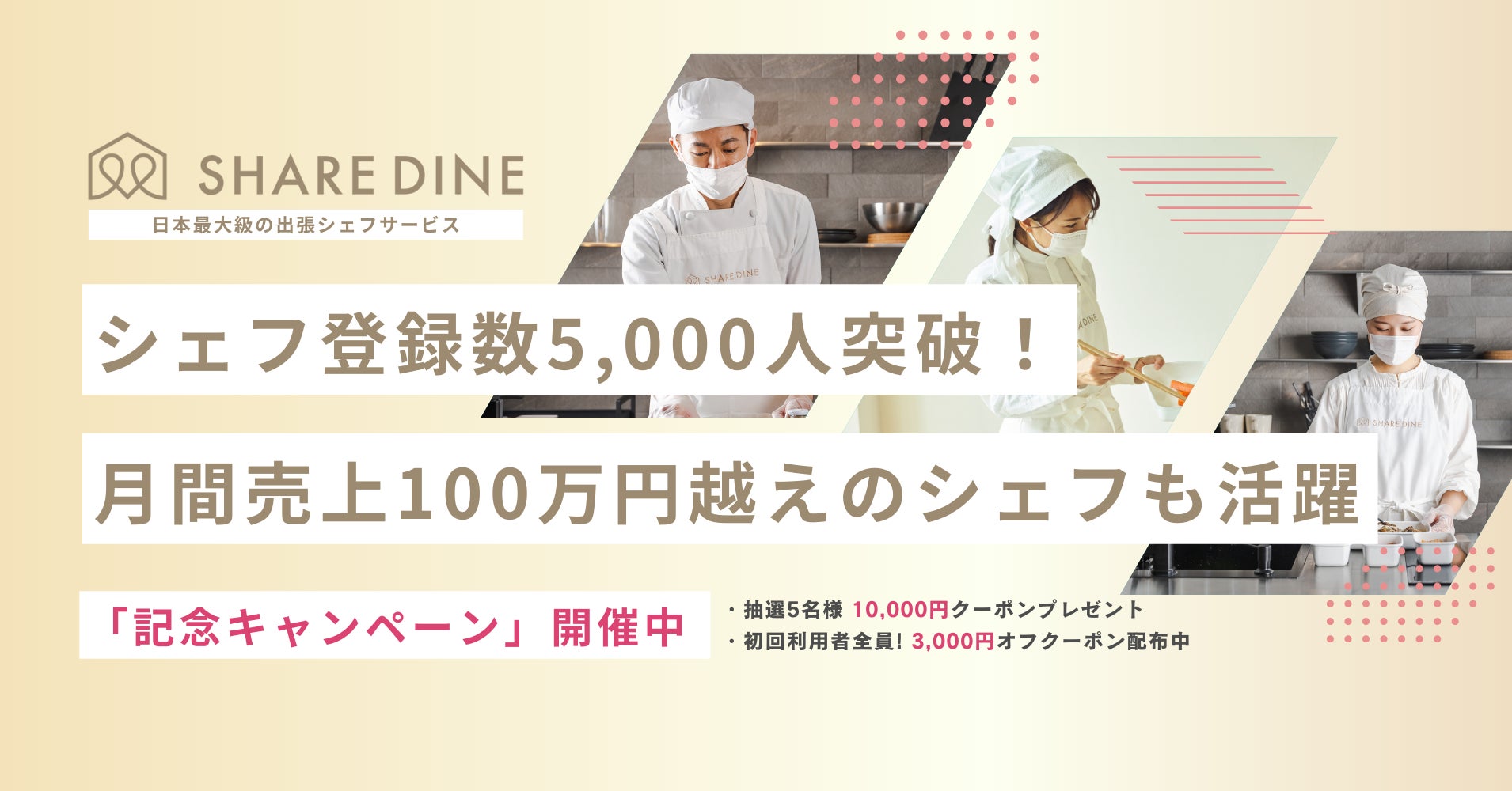 シェアダインでは、シェフ登録数5,000名を突破したことを記念し、シェアダインをお得にお楽しみいただける割引クーポンをプレゼントいたします。