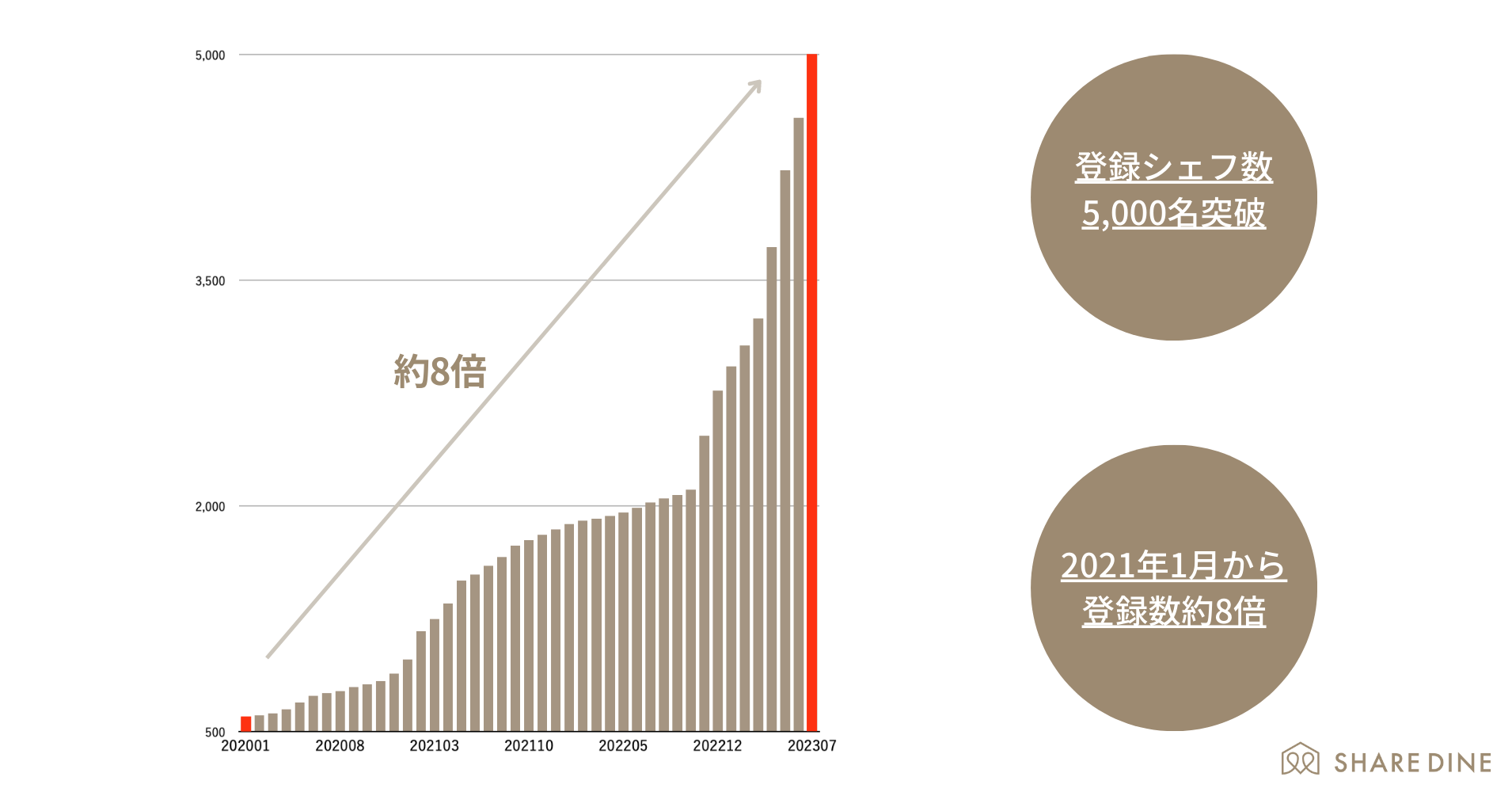 栄養士・調理師などの資格を持つ食の専門家から、星付きレストラン出身のシェフなどプロの料理人が登録する日本最大級の「出張シェフサービス」シェアダインは、食の悩みを抱える子育て世帯を中心に食の専門家がご家庭のキッチンで作り置き料理を調理するサービスとして誕生し、累計100万食を超える食事をご家庭に提供してきました。コロナ禍で飲食店の休業要請が相次いだことをきっかけに、シェフの登録数は伸び続け、コロナ禍以前のシェフ登録数と比べ約8倍の規模まで成長しました。